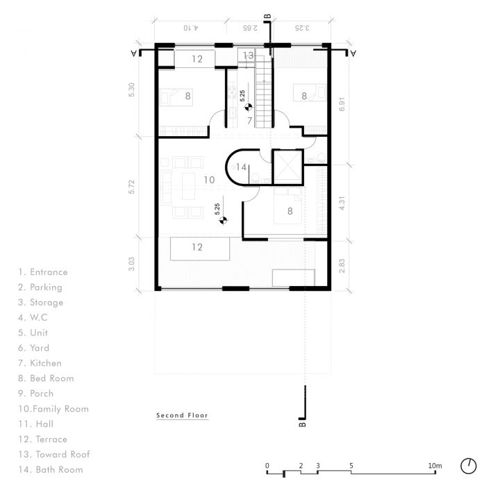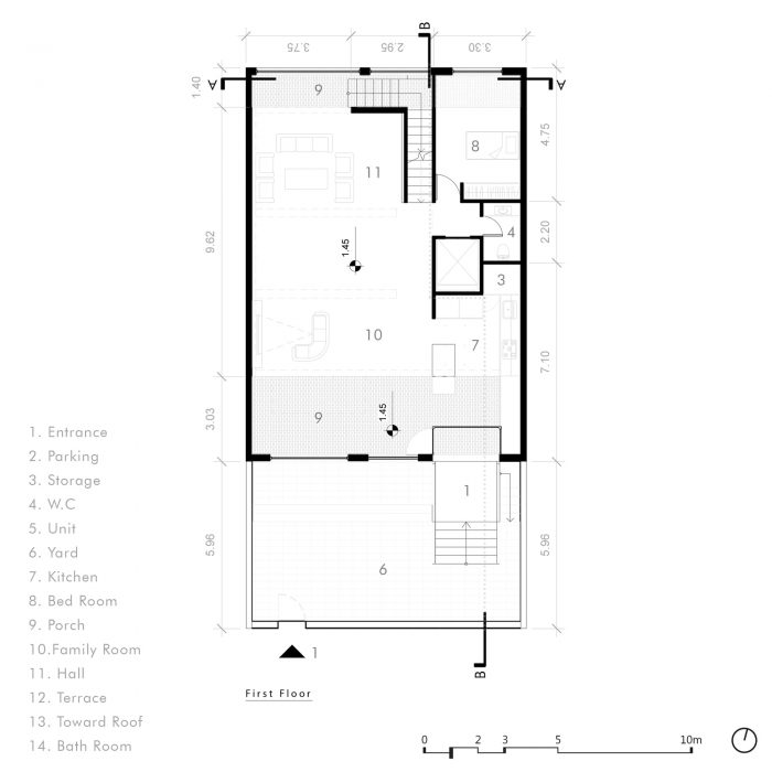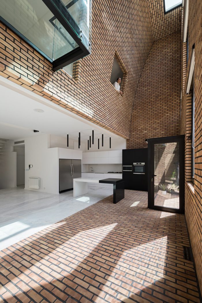 Nowadays, in conventional houses, the boundary between the indoors and outdoors is set by the walls and the thresholds such as the doors and the windows allow for penetration in and out. In the present project, due to the use of two brick spatial envelopes on the two sides of the house, the boundary has changed into two livable empty spaces: Two half-open/half-closed porches, the intermediate Living spaces of the family with the street/alley. These two empty spaces have revealed the relation between the indoor and the outdoor and the sky and the horizon, and at the same time, have connected the floors.
