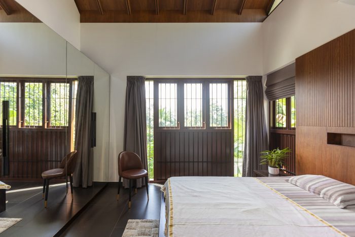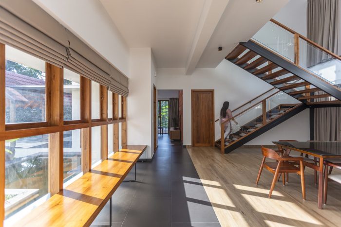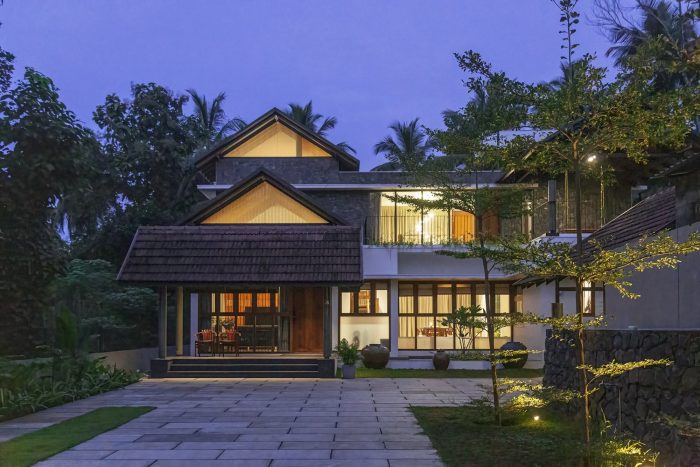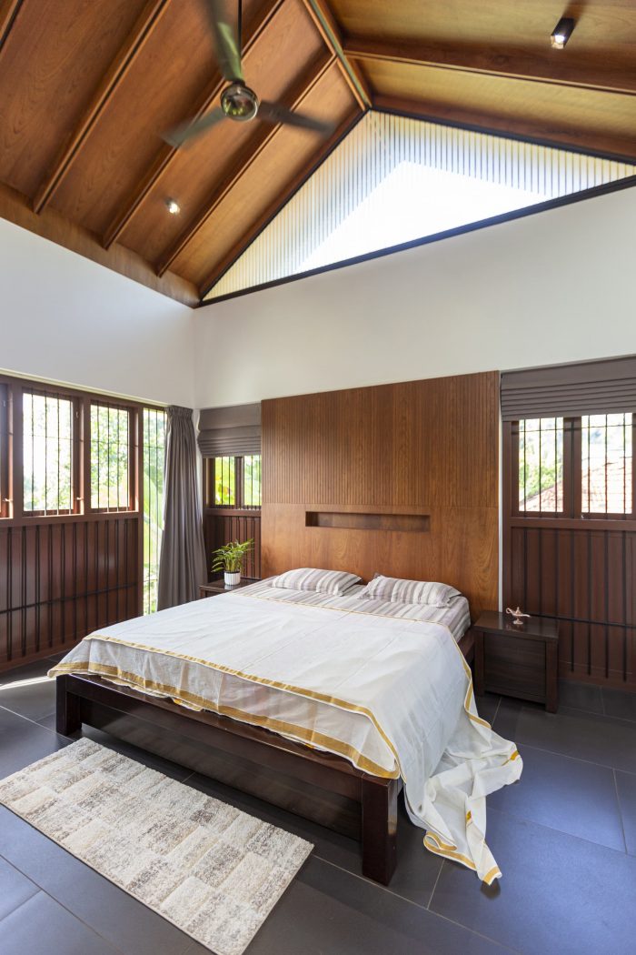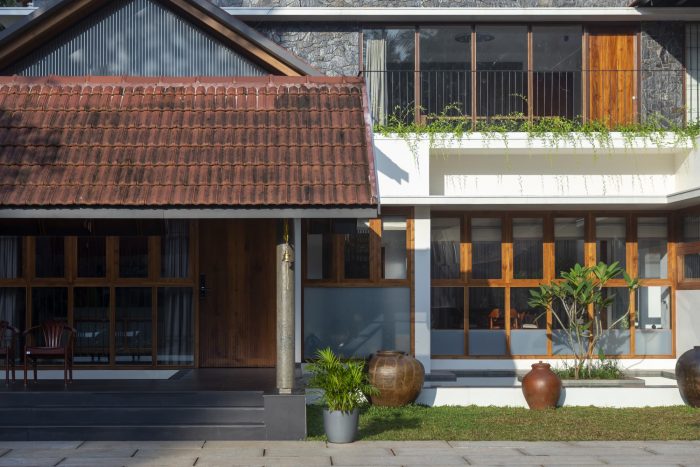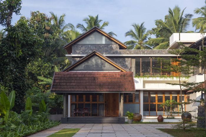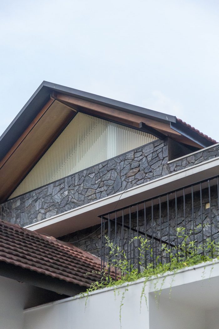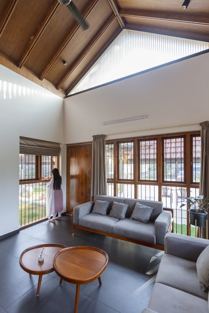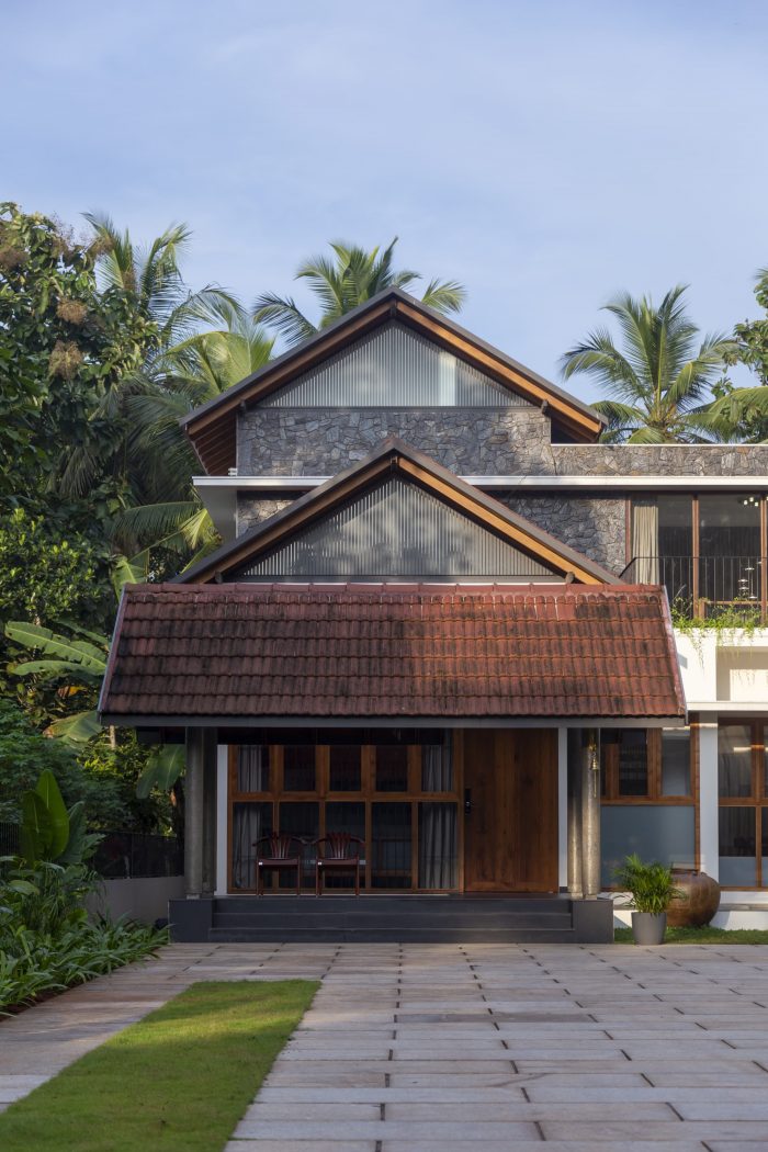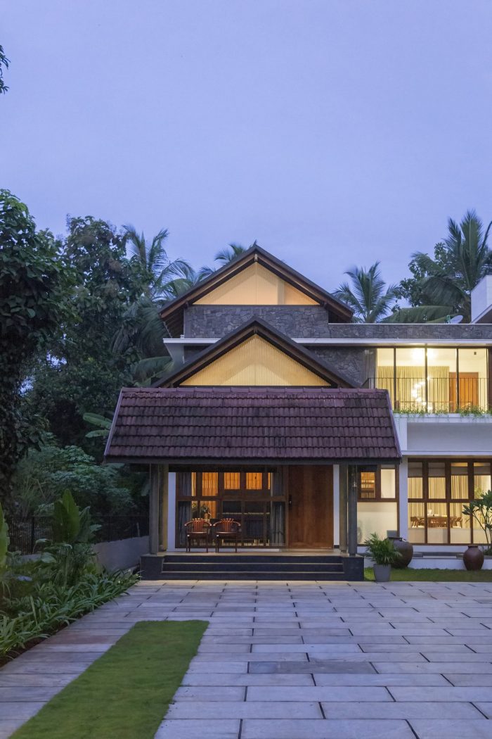 As one enters the house, one can see that a foyer and a courtyard adjacent to the sit-out help to maintain privacy by detaching the sit-out from the other residential spaces. In this design, the roof was the most relevant element which reflects traditionality. The roofs are traditionally cladded with Mangalore tiles. The underside of the typically gabled roof is cladded with plywood and veneer. The elegance of the house is achieved through its form, material, and color palette.