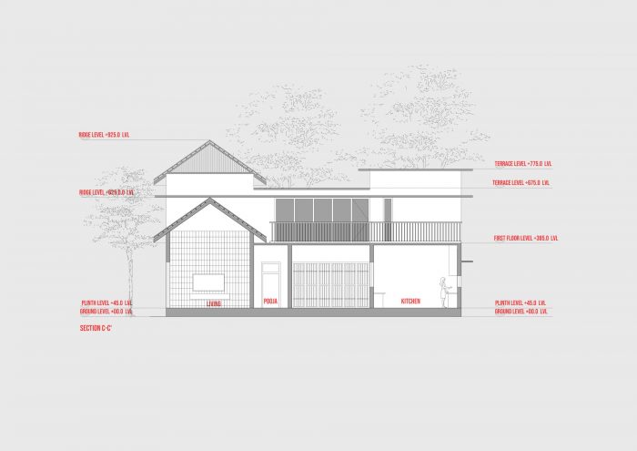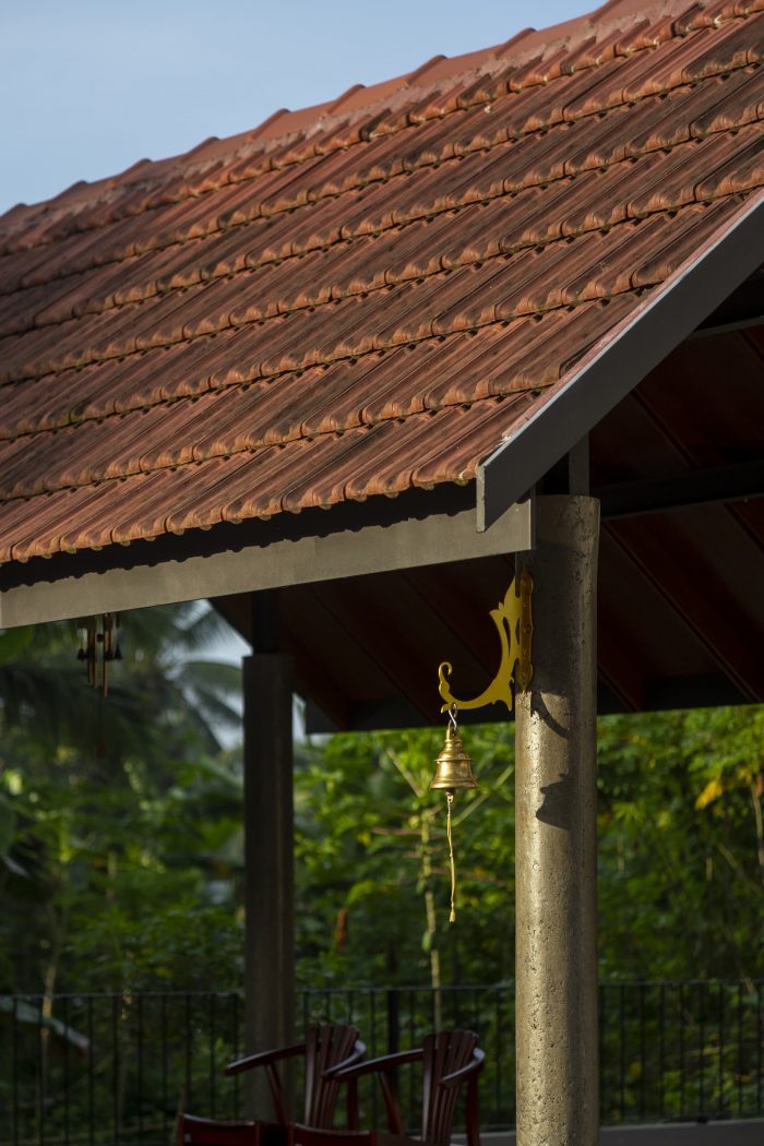 Inclined home is a place perfect for relaxation and retirement life. To create such an experience, it was important to enhance its surroundings. One of the major positives of the site is its entry from the east. A good amount of warm morning sunlight enters the house through the large openings. At the entrance, four trees are planted to enhance the shade and the shadow of the house. These create different patterns at different times inside the house. The residence does not block the views of the surrounding. The landscape of the house is dominated most by tropical plants. The water body adjacent to the sit-out and pooja room has a small planter box in which Plumeria rubra is planted, giving an island effect that also creates an internal aura of reverence and tranquility.