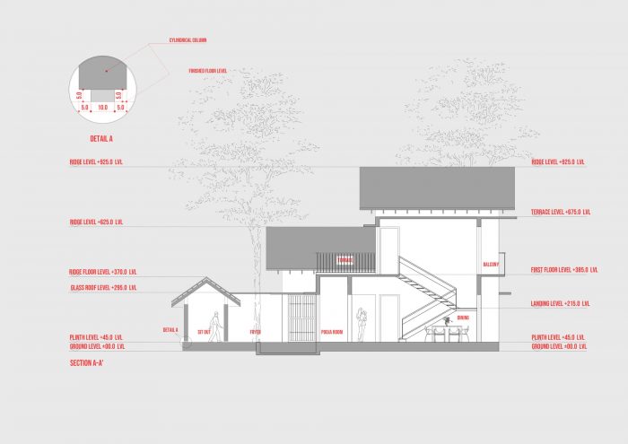 The house is zoned into a living area, and two bedrooms, with a balcony and a terrace on the first floor. The spaces are planned around the dining area with a large opening that flooded the houses with natural light which offers a deliberate engagement with the outside elements. The house performs well climatically as natural materials are used. The facade of the residence has its own features from the solid flat roof, sloping roof interweaved glass lush greens. All the spaces in the residence are designed to capture the natural light outside combined with lush green views.