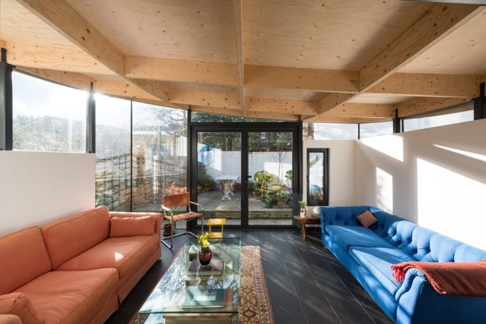 To control solar gain and glare, the roof peels upwards to take advantage of low winter sun and maximise the visual connection to the garden. The roof overhang shades the glazing from the high summer sun thereby creating an effectively insulated space with a tactile exciting roof.