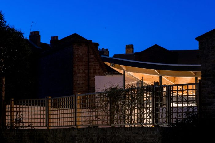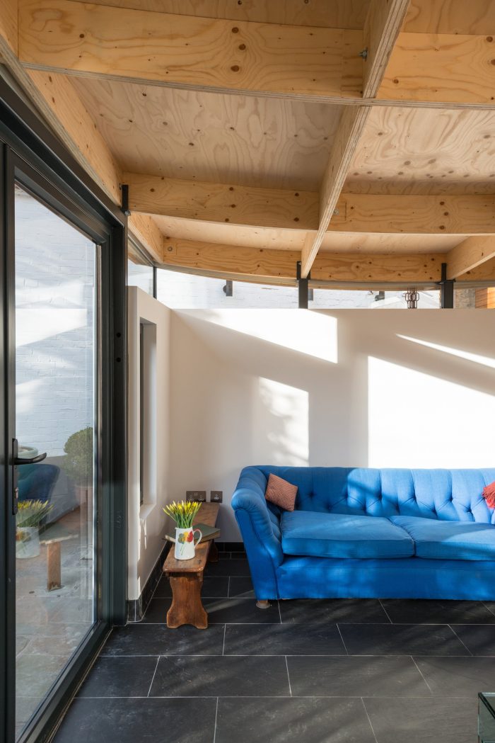 The result is a unique calm space. The roof is tactile and well within reach at its lowest points. It encourages visitors to touch it and look at it. The curve draws the eye outwards and upwards. It is an uplifting space that feels connected to the outside but isn’t overexposed as the previous fully glazed conservatory was. The light and temperature is now well regulated, making it a functional and enjoyable space to be in.