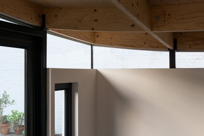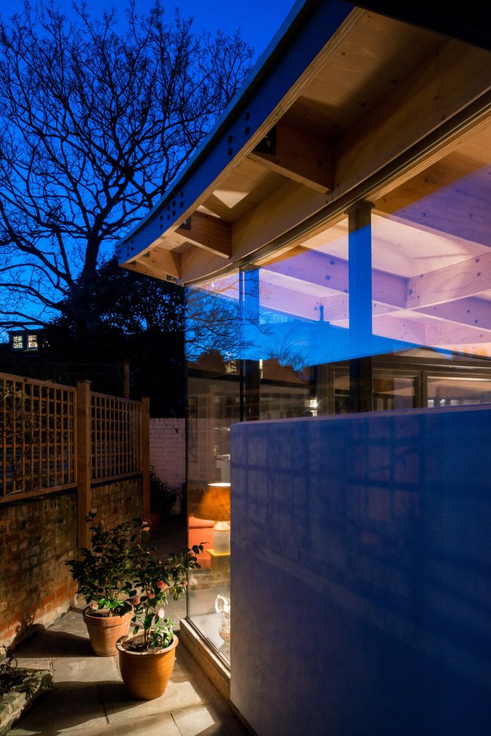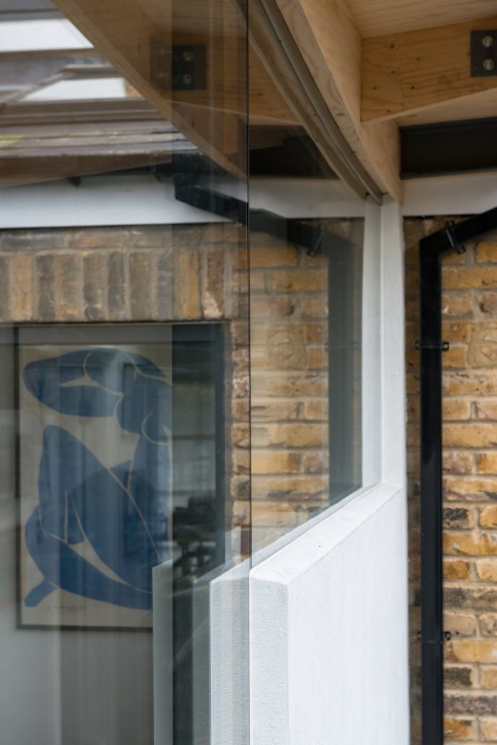 The roof dips down along its western edge to respect the adjoining neighbours’ view by matching the eaves level of the old conservatory. A clerestory all round lifts the roof so it appears to float.