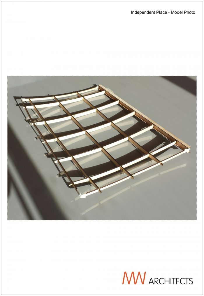 MW Architects, in close collaboration with Structure Mode, designed a lightweight roof comprised of a lattice of beams which curve in both directions, with a stressed plywood skin. The roof is supported along the rear edge and on six square steel columns.