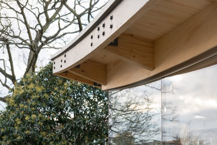Curved roof beams were cut from LVL timber panels and then bolted together on site. This careful material choice enabled the beams to be small enough to maintain head room, whilst each structural grid connection is self-reciprocating - the curving edges provide stability to the cantilevering eaves.