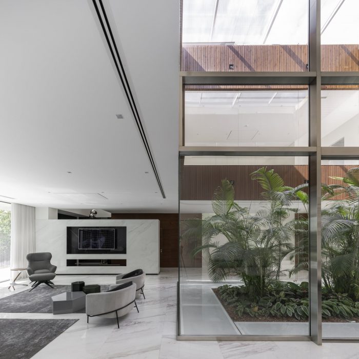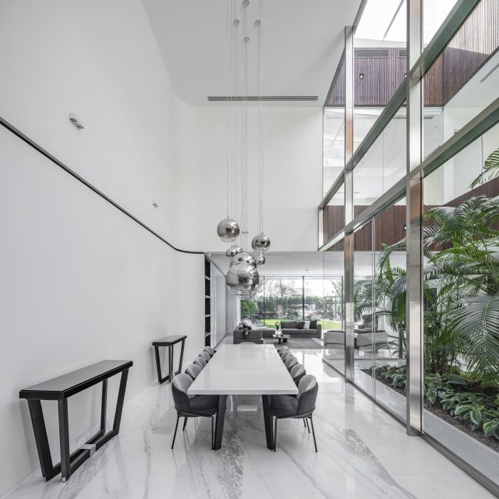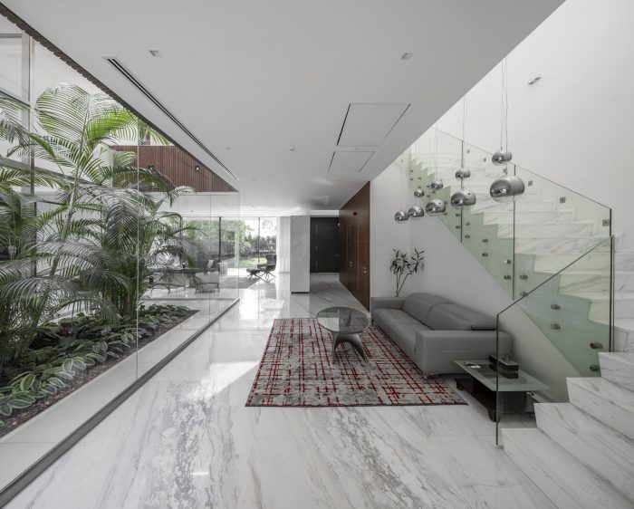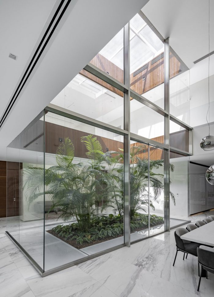 受传统波斯建筑的启发--主要是庭院式房屋的配置及其微气候效应--一个带有可伸缩屋顶的玻璃内花园被安置在别墅的核心区域,为建筑的每一层提供足够的日光和新鲜空气。内花园周围的玻璃板保证了足够的光线被带入位于-1层的游泳池区域。
