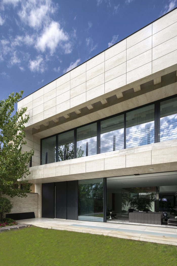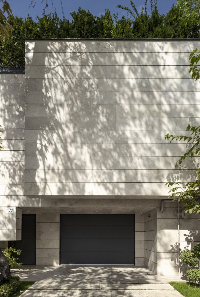 This 1400 m2 high-end freestanding villa in Tehran is built against a mountainside, with a garden that is raised 17 meters above street level. The facade is clad with natural travertine stone: a famous high-quality local product collected from the Iranian mountains. The wish of the owners to park their cars underground, resulted in a 20-meter-long tunnel below the garden, leading towards the parking underneath the villa.