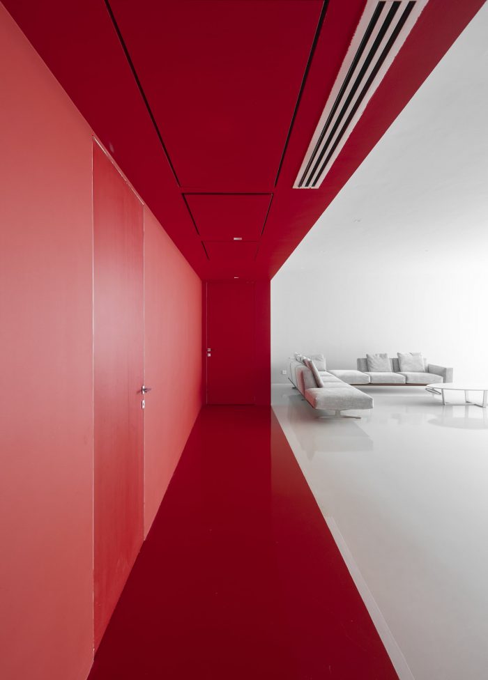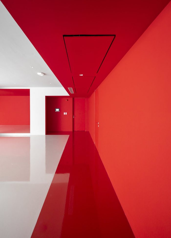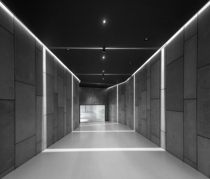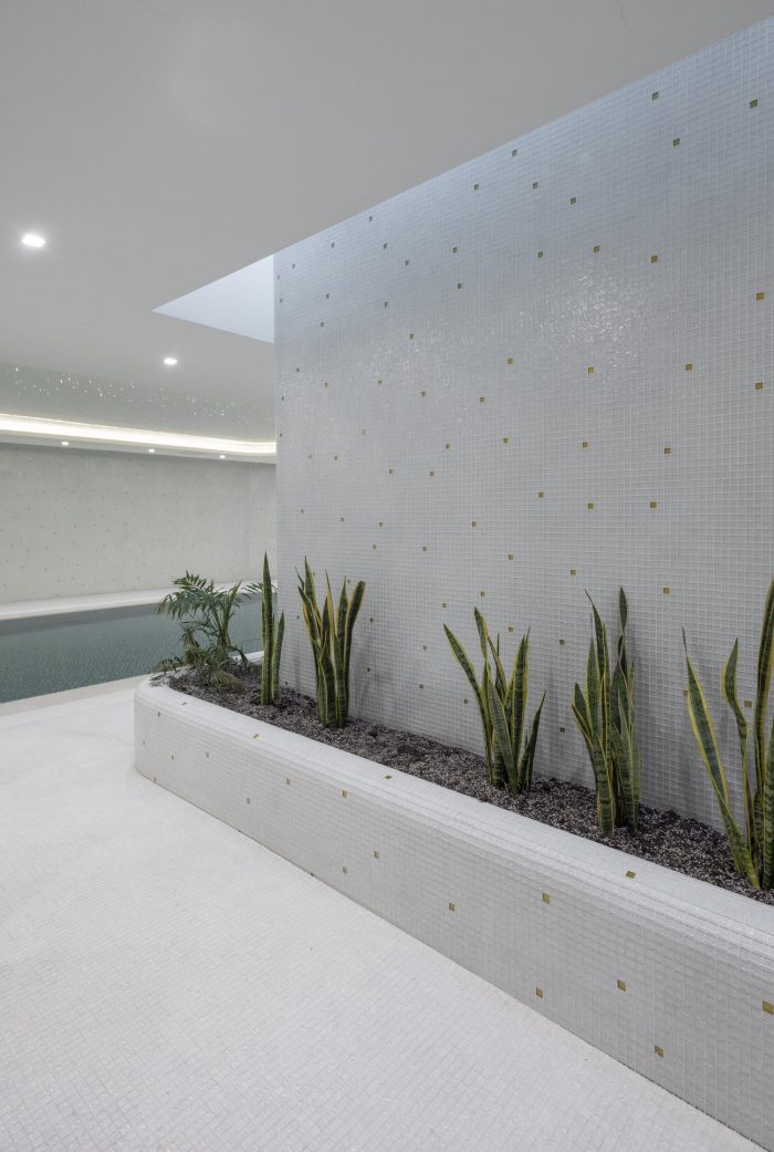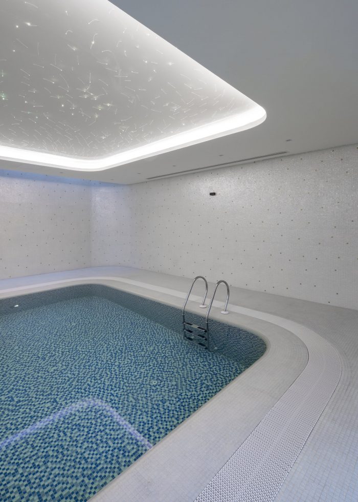 Purity and hygiene were very important themes during the design development, which have been considered in the detailing of the design, to facilitate cleaning and to ensure a fixed sequence of successive spaces in the wellness area (entering a corridor, then a changing room, then entering the showers) before entering the swimming pool. The special lighting makes the ceiling above the pool look like a twinkling starry sky.