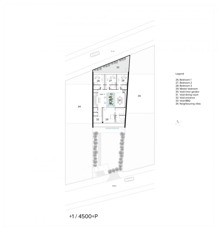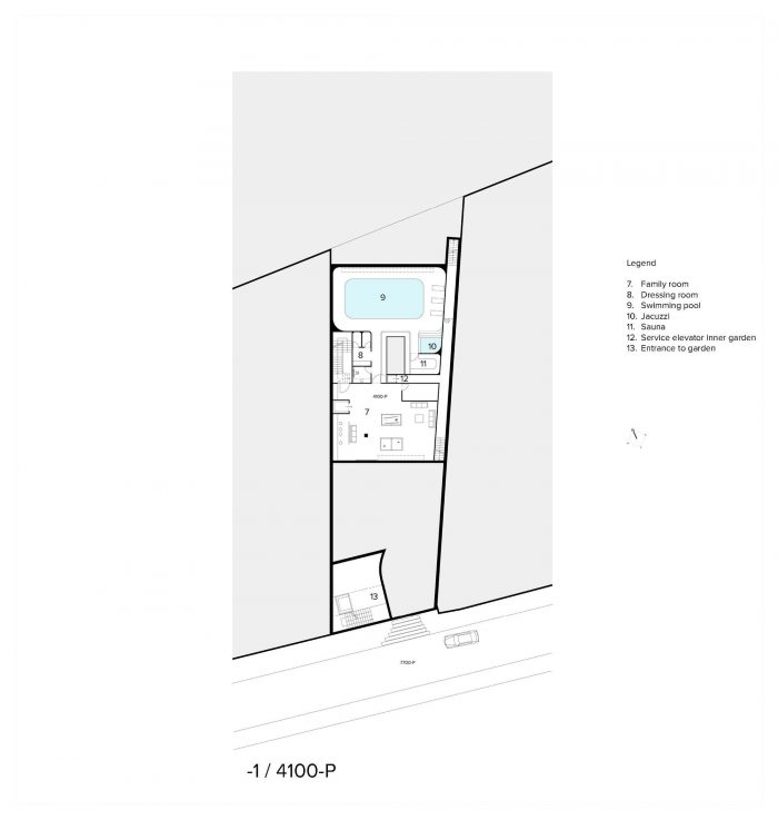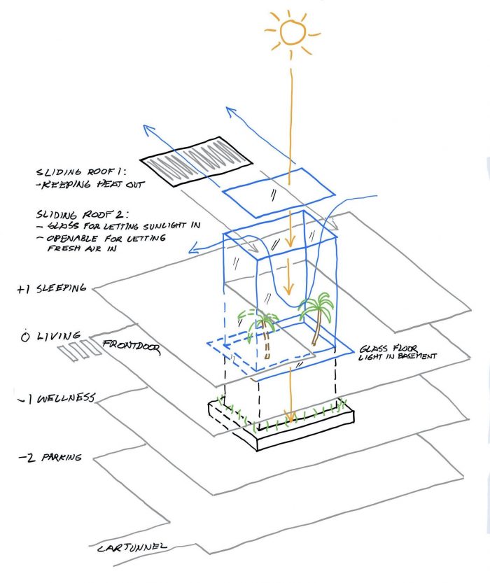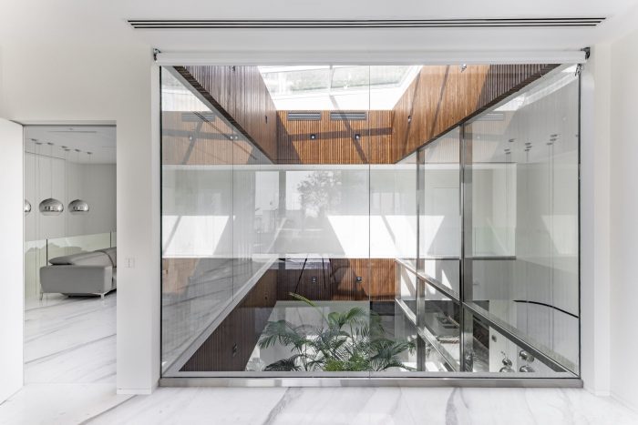 Inspired by the traditional Persian architecture - mainly the configuration of the courtyard houses and their microclimatic effect - a glazing inner garden with a retractable roof is positioned in the core of the villa, providing the building with enough daylight and fresh air on every floor. The glass panes around the inner garden guarantee that sufficient light is brought into the swimming pool area located at level -1.