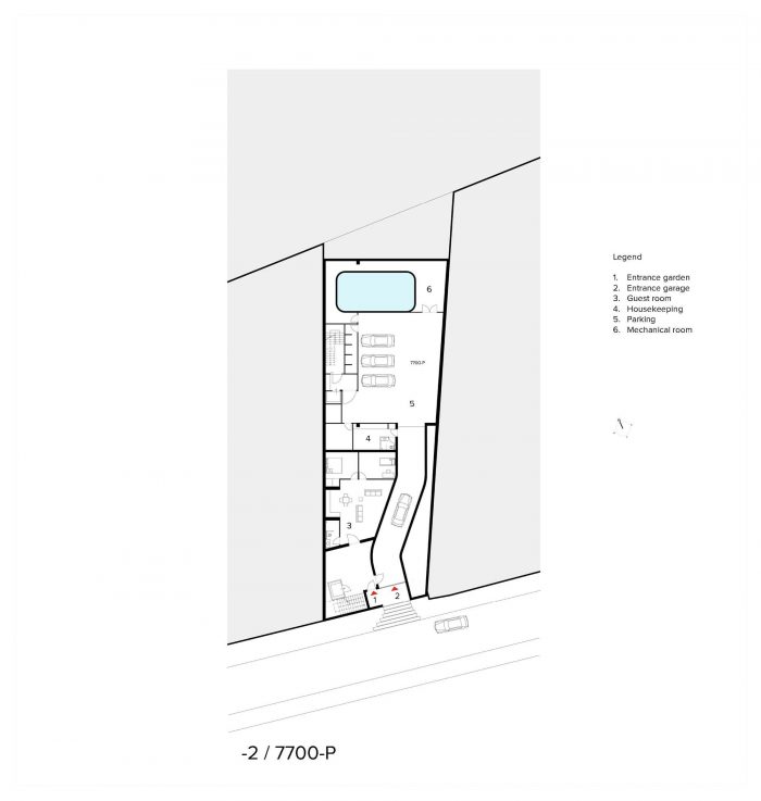 The villa has 2 underground floors and 2 floors above ground. The lowest floor is at the southern street level, with a tunnel leading to the parking garage. Visitors enter the villa via stairs or elevator and a walk through the garden.
