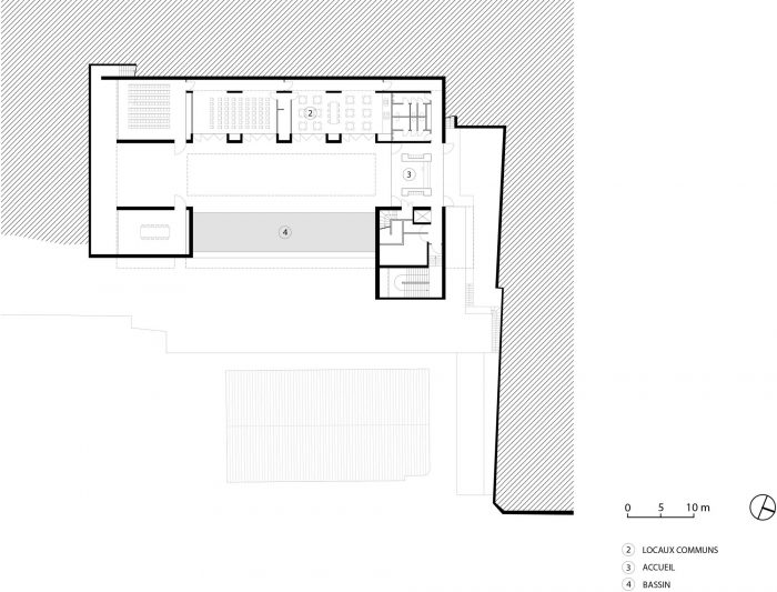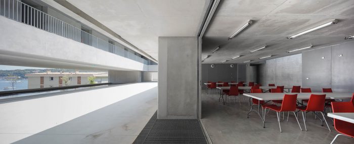 These common rooms are linked by corridors, naturally lit by skylights. Folding glass doors allow the rooms to be fully opened to the patio; reminiscent of the functionality of the dockside boat sheds. The simple, uncluttered language of the building responds to the nature of the activities that take place within it. Indeed, daily diving outings require functional, resistant, and solidly designed spaces. No over-sophistication is evident and this posture; theoretical and pragmatic, secured the support of the client. Adaption to the slope weighed heavily on the price but the build participates in buttressing the land above. On this site designated inhospitable, architect and client have united to create a project that fosters reflection, exchange, and conviviality.