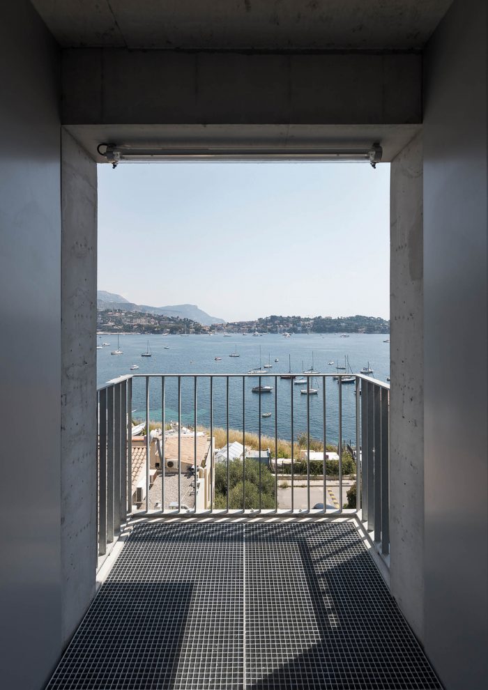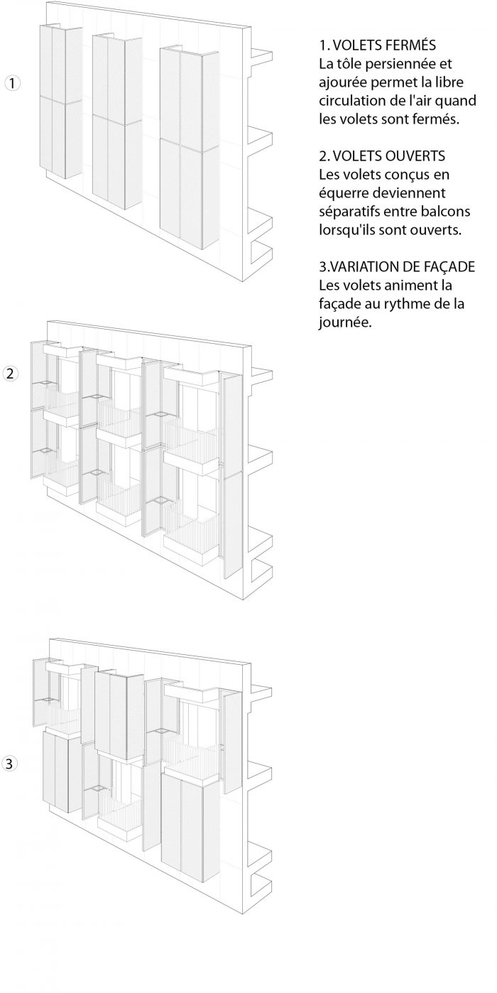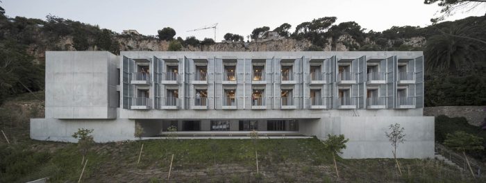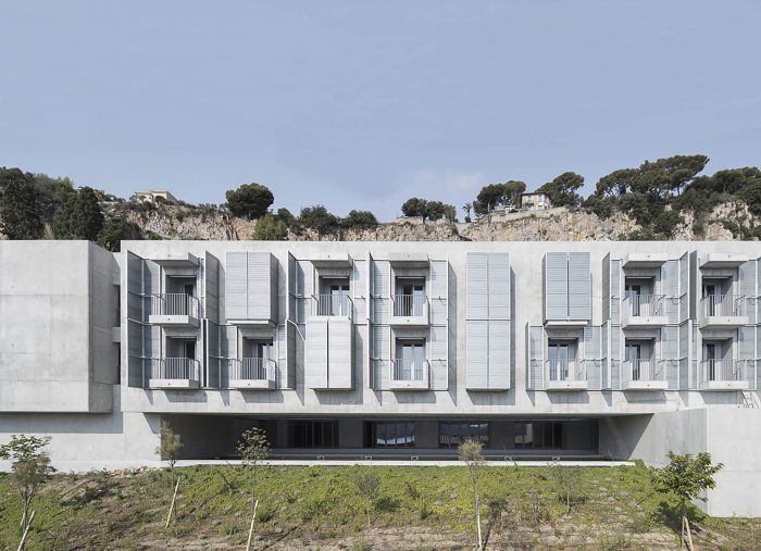 Built of concrete from nearby quarries it references the cliffs that overlook it. Metal shutters double as screens on the balconies and recall the windows of the rope-works and armory, local buildings of architectural heritage. The association of concrete masses and metal shutters creates a dialogue between archaism and contemporaneity.
