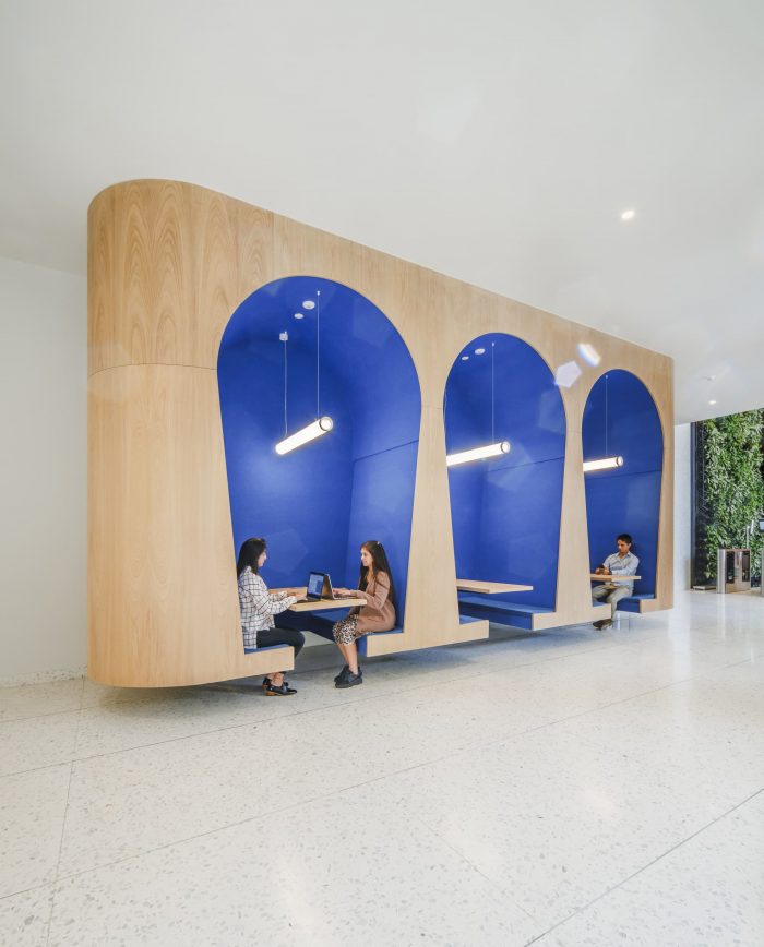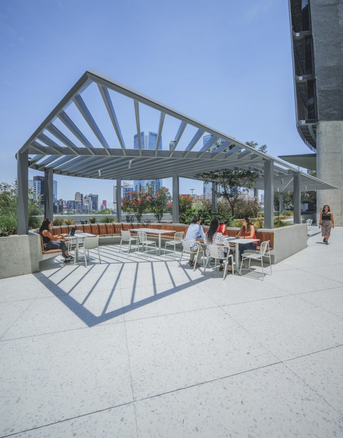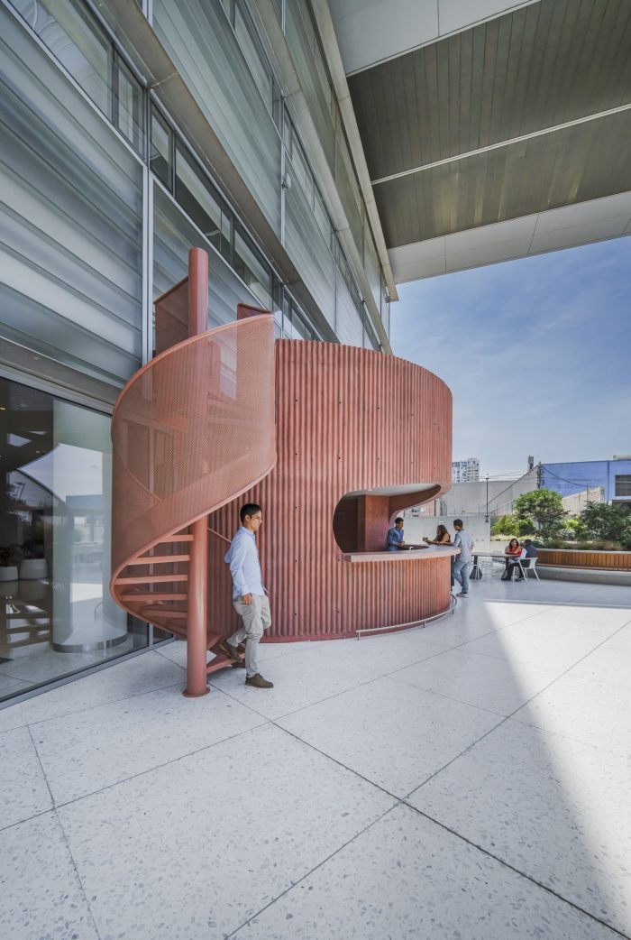 WORKac’s design spans the ground floor and public spaces of the tower with work and social hub and ample shaded outdoor working space. Designed pre-pandemic to host client meetings, support remote workers, and bring nature and light into the building, it has proved remarkably prescient for the types of spaces required for post-pandemic work.