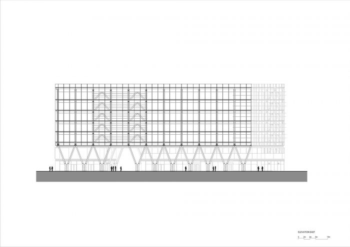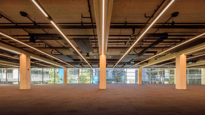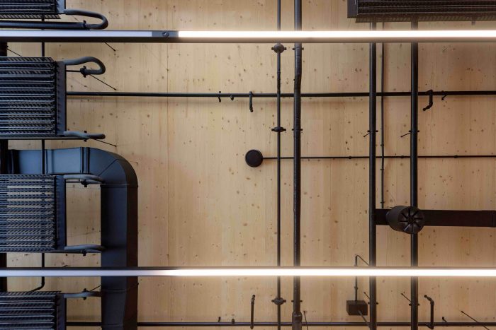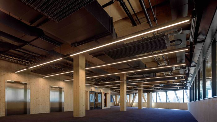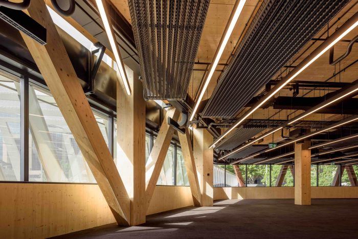 The building explores a new form of beauty, one of unique and integral character, with outstanding green credentials. It expresses with aesthetic potency the fully exposed timber structure, stripped of additional layers of finishing materials.
