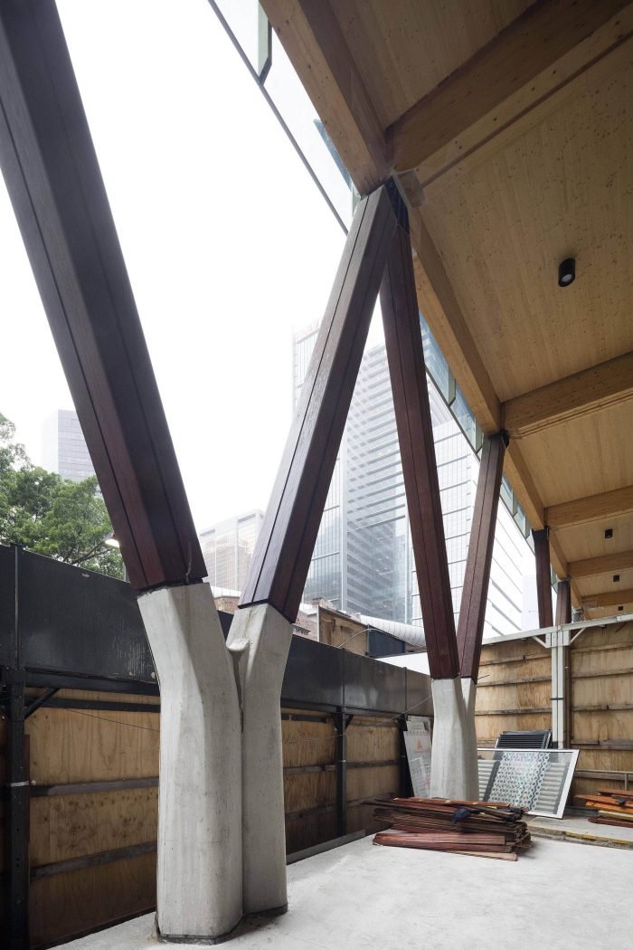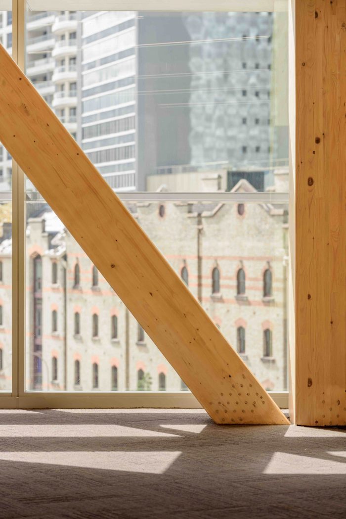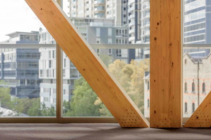 The most striking aspect of International House Sydney is that six above ground levels are constructed entirely from engineered or cross laminated timber, including floors, columns, walls, roof, lift shafts, egress stairs and bracing bays, supported by a single ground retail level of conventional concrete structure.