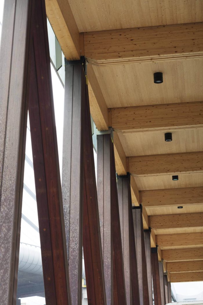 The design turns the structural limitations of structural engineered mass timber and recycled hardwood to advantage, establishing a strong visual presence and legible load path through the building column and beam construction. The double height colonnade bracing columns made from recycled ironbark evoke memories of the forest origins of timber, these ancient trees respected in their new industrial use to further distinguish the architecture and its contribution to the design of the public domain.