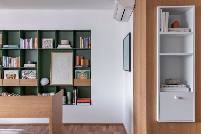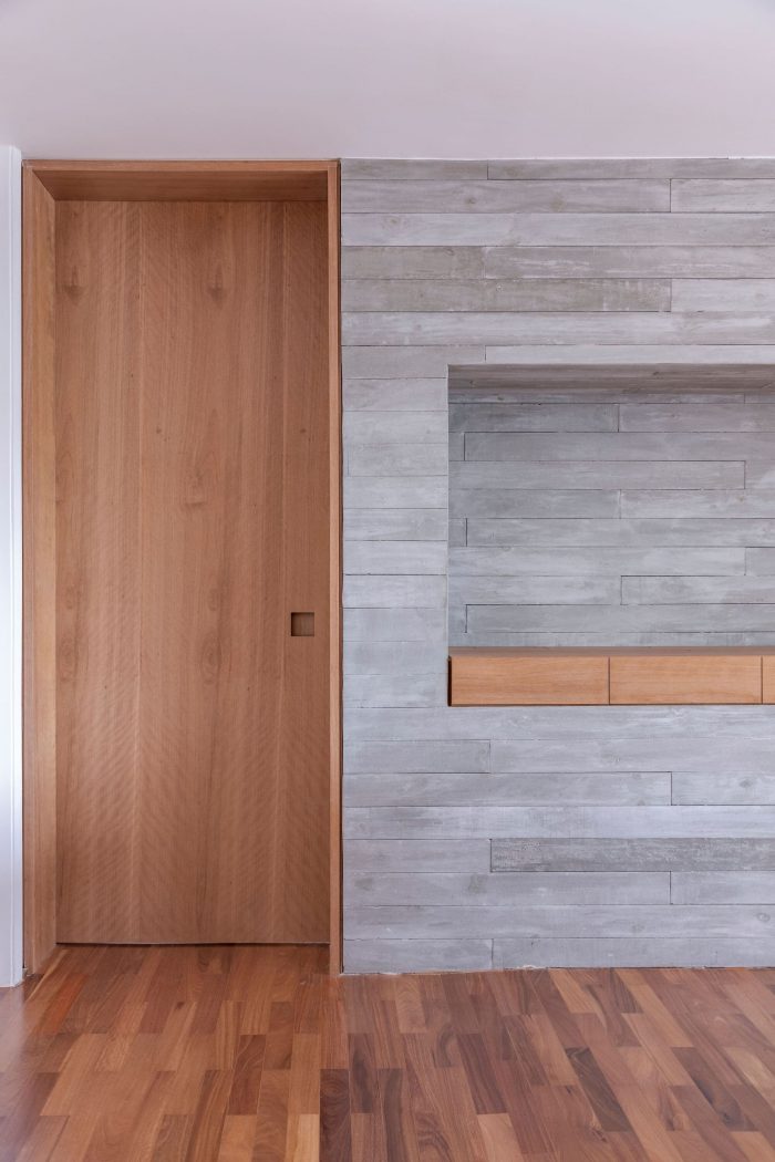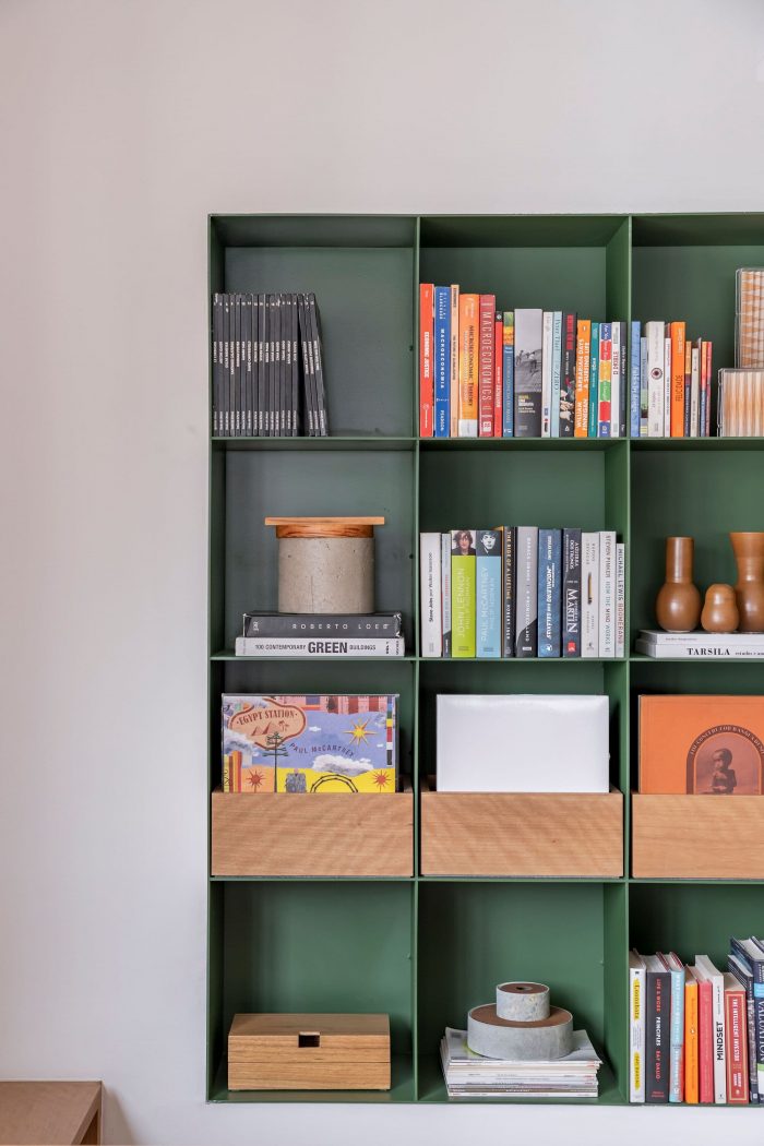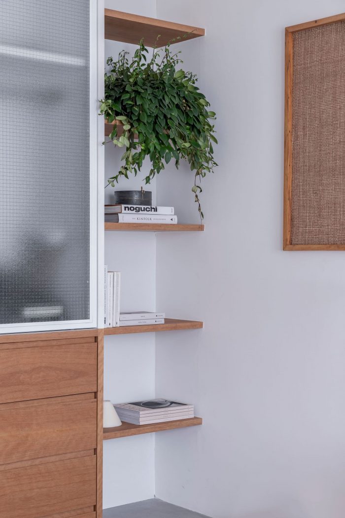 几个环境的结合,尽管给项目带来了振幅,但也带来了挑战。作为一个建筑解决方案,我们提议在项目的一些引人注目的元素之间取得平衡。在大窗户下面设计了一个大长凳,低矮而线性,满足了低矮图书馆的功能,同时也是一个接待长凳,我们在它旁边有一个绿色的金属制品的大书柜。按照同样的概念,混凝土板条中间的餐具柜的壁龛被设计成与公寓另一端的木板相对应,该木板从社交入口处一直延伸到洗衣房。该项目的物质性被认为是为了传递客户的个性,年轻和易于接受。该建筑原有的镶木地板和窗户都得到了修复。卡图阿巴被选为项目的主要木材,因为它的棕色调和易于与项目的其他材料结合。