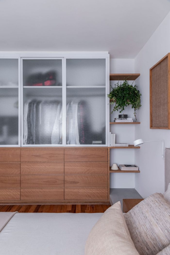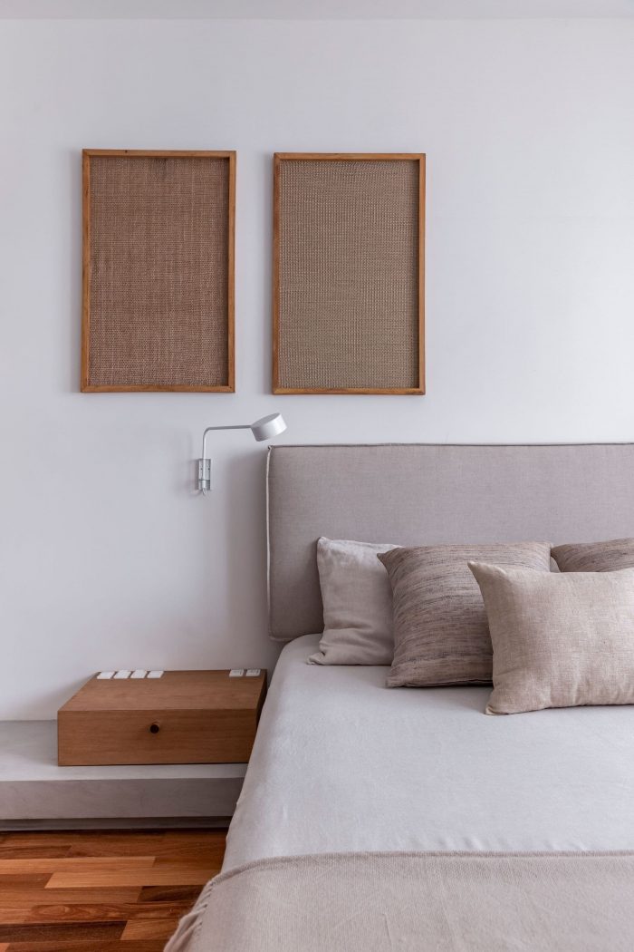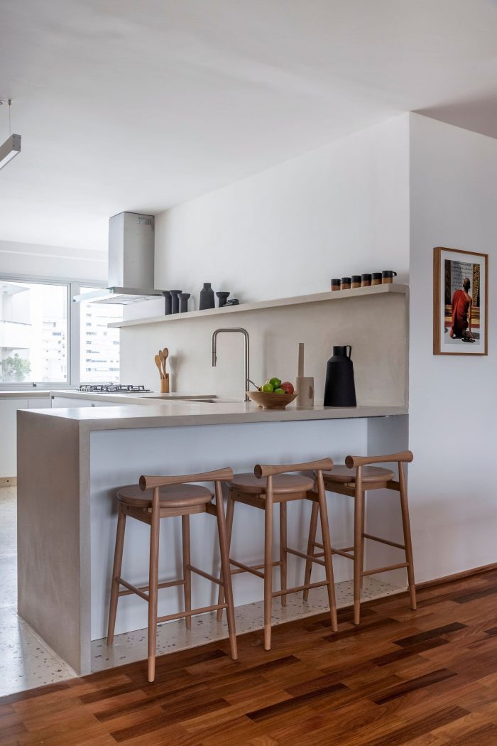 Despite a neutral palette as a base, the project has elements that bring personality to the project. Some points of color are present in the bookcase and furniture, as well as the concrete slats, the kitchen countertop in mineral texture and the floor of the kitchen and bathrooms in natural stone granilite. The client's greatest desire was to value Brazilian design, from renowned names such as Cláudia Moreira Salles and Carlos Motta, to younger designers such as Guilherme Wentz and Marcelo Caruso.