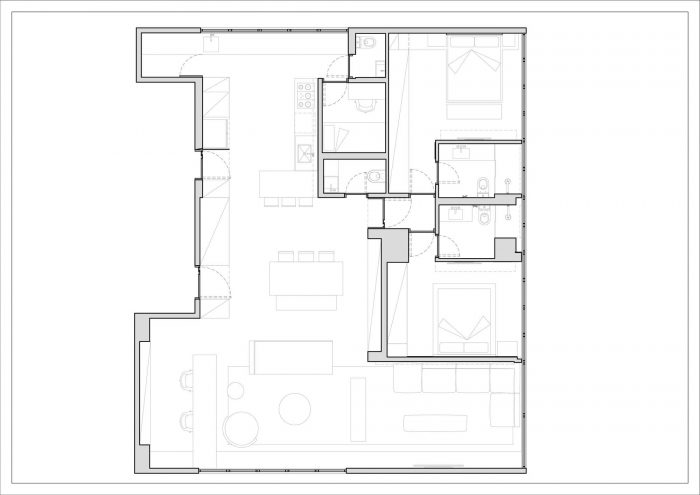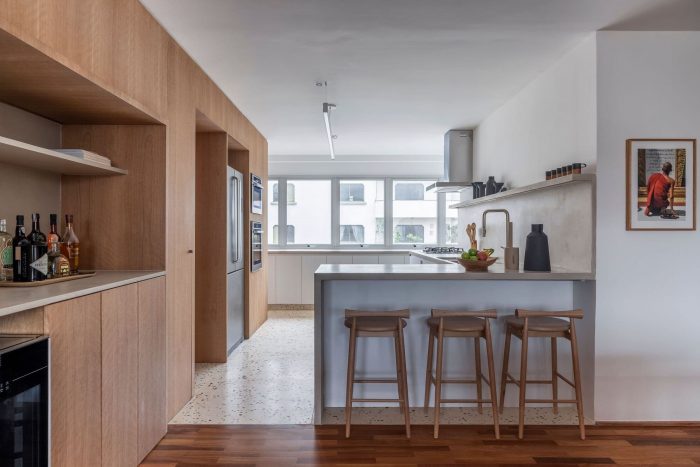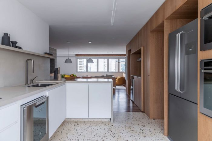 The apartment is located in the Riachuelo Building, a 1972 project by architect Ruy Ohtake. The project sought to explore and value the building's original construction elements, especially the large windows. By demolishing the original walls between dining room, hallway, and kitchen, it was possible not only to integrate these environments, but also to make natural lighting and cross ventilation essential to the apartment.