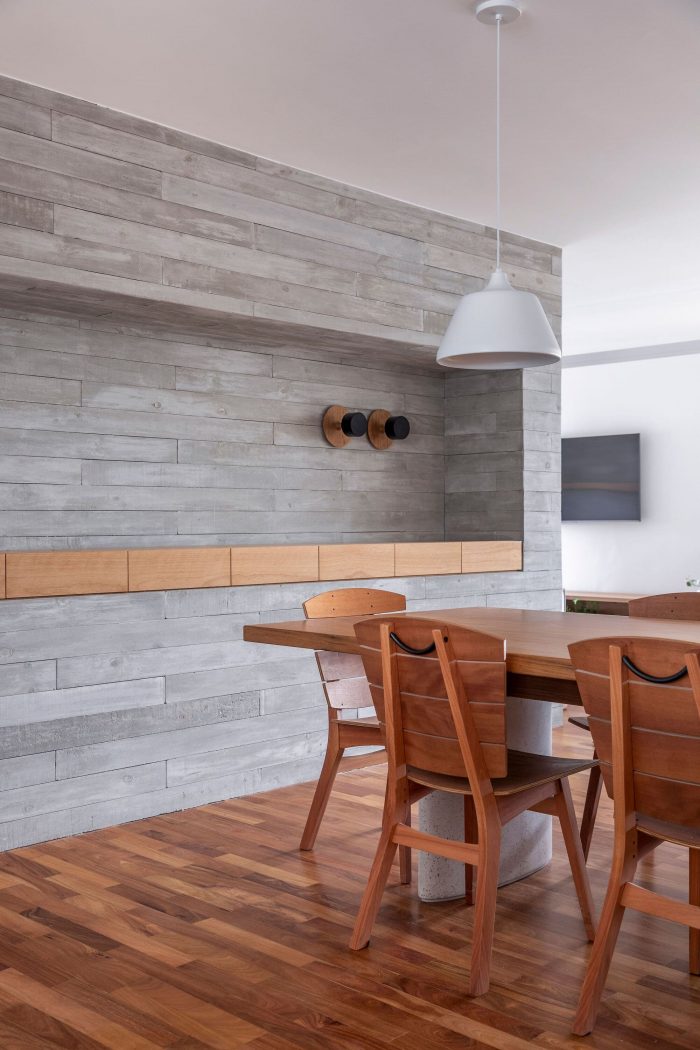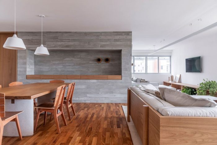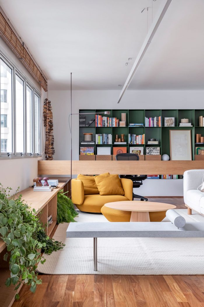 The union of several environments, despite bringing amplitude to the project, also presented challenges. As an architectural solution we proposed a balance between some of the project's striking elements. While below the large windows we designed a large bench, low and linear, that fulfills the function of a low library, as well as a reception bench, we have next to it a large bookcase in green metalwork. Following the same concept, the niche for the sideboard in the middle of the concrete slats was designed to be a counterpart to the wood panel at the other end of the apartment, which runs from the social entrance to the laundry room. The materiality of the project was thought to transmit the personality of the clients, young and receptive. The building's original parquet flooring was restored, as were the windows. Catuaba was chosen as the project's main wood for its brown tone and ease of integration with the other project materials.