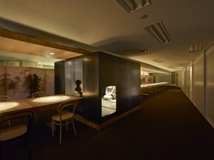 Iron Tea Room. The Iron Tea Room is located in the Tokyo offices and gallery of Charley, a company that designs and sells zakka, which might be loosely defined as everyday items with style. The tea room includes a seventeen-meter-long table placed in front of a long, folding room partition printed with images from Hasegawa Tohaku’s Pine Trees screen. Although the client did not directly bring up zakka or Japanese style in discussions, we felt that these were the themes of the gallery and therefore incorporated them into our design proposal.