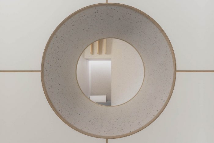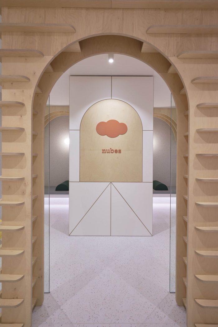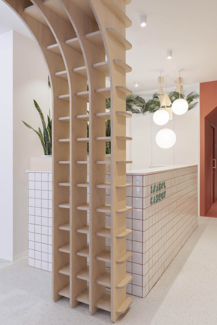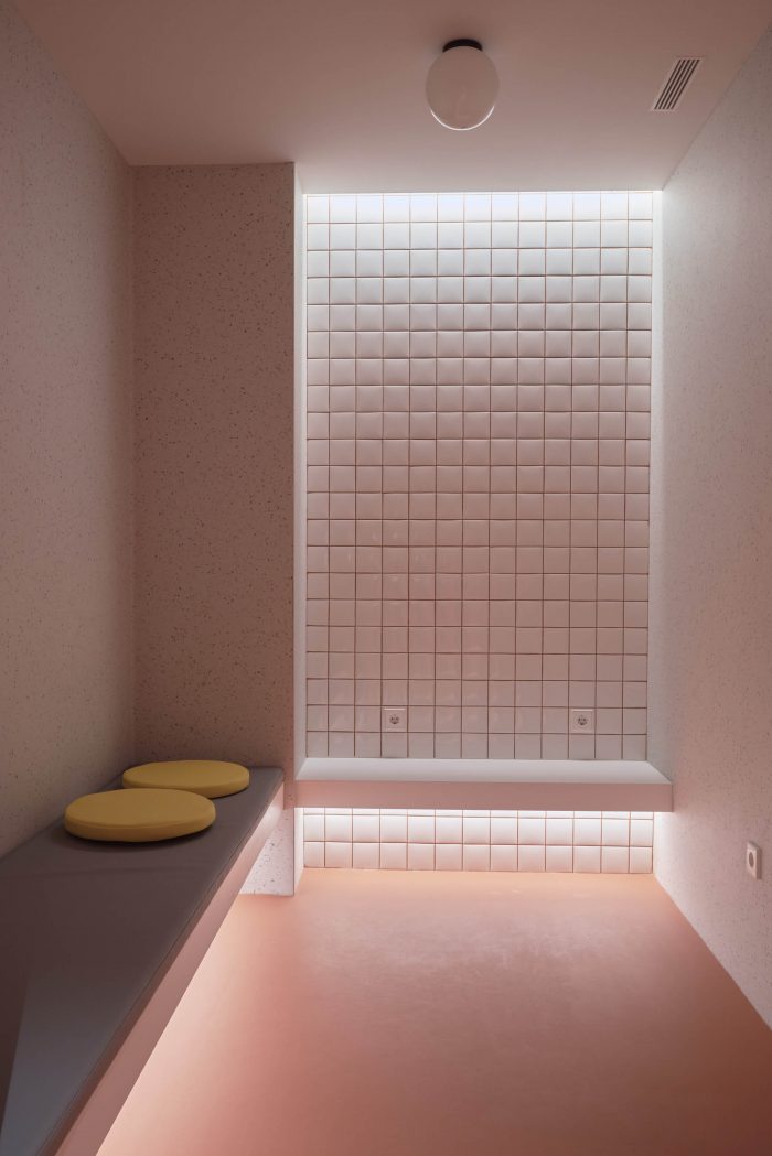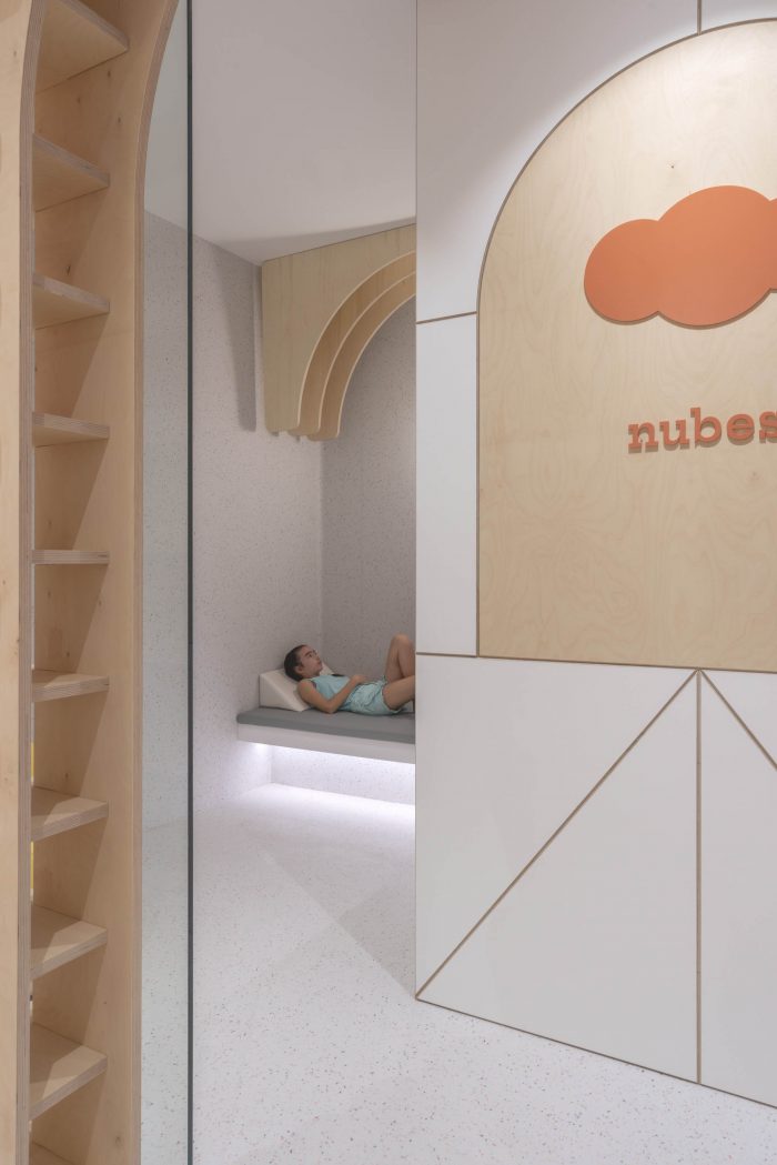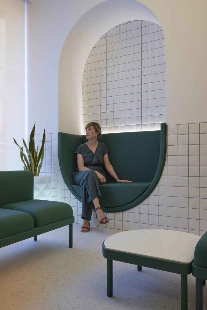 The waiting area is a bright and open space that is delimited and articulated with versatile and modular furniture. After entering through a 3-meter-high arch built with pieces of wood, the capsule-shaped holes with comfortable upholstery take center stage that invites relaxation and generates a feeling of protection. The aim is to provide patients with calm and well-being with gentle shapes and warm indirect lighting.
