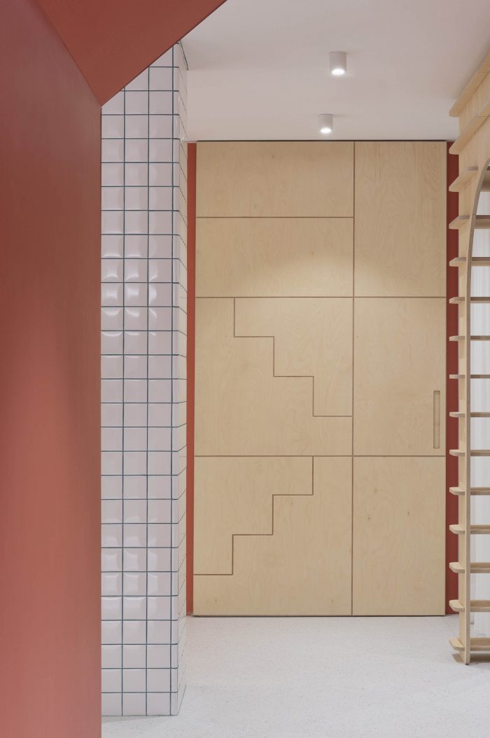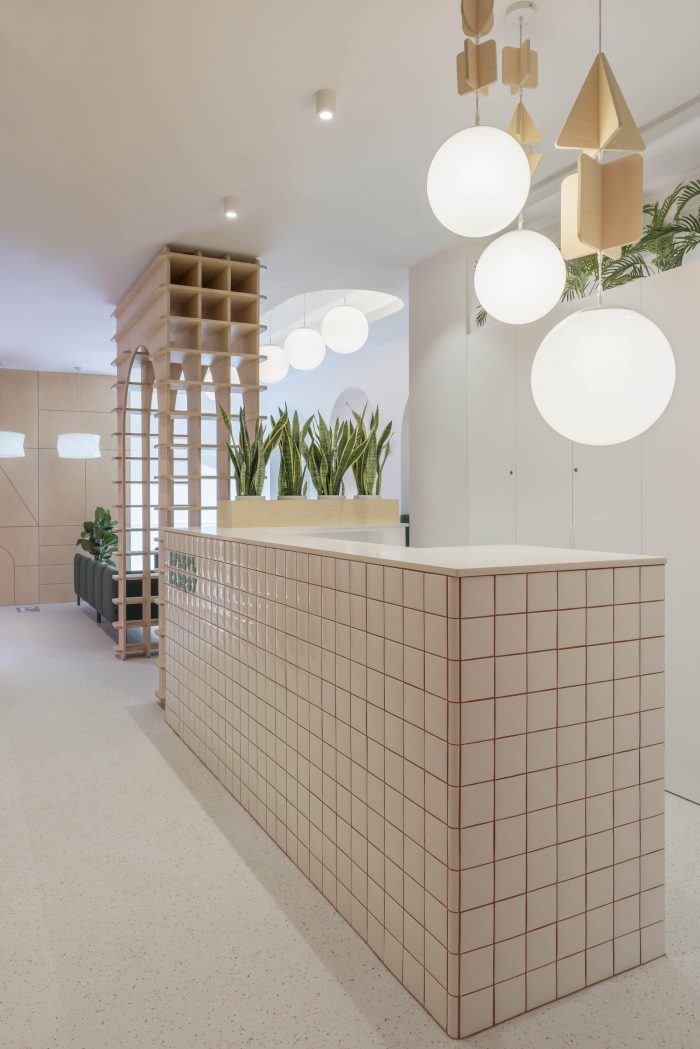 The reception of the clinic is lined with 10x10 ceramic grouting in the corporate color, reminiscent of the typical grid of notebooks. The walls are protected with pantographed birch plywood panels that help convey warmth and calm. Plants and plant elements are important in the main points of contact of the clinic with patients (such as reception and treatment cabinets) due to their positive effect on mood.