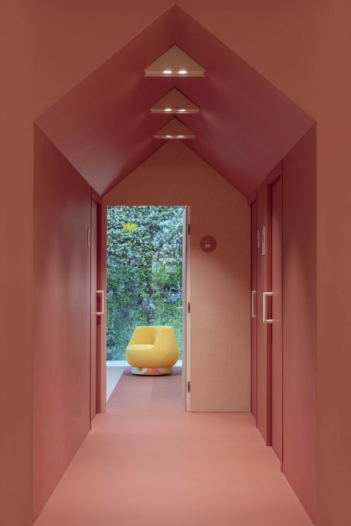 候诊区是一个明亮和开放的空间,用多功能和模块化的家具来划定和衔接。在通过一个用木片搭建的3米高的拱门进入后,带有舒适软垫的胶囊状洞口成为中心舞台,吸引人们放松并产生一种保护感。其目的是通过温和的形状和温暖的间接照明为病人提供平静和幸福。
