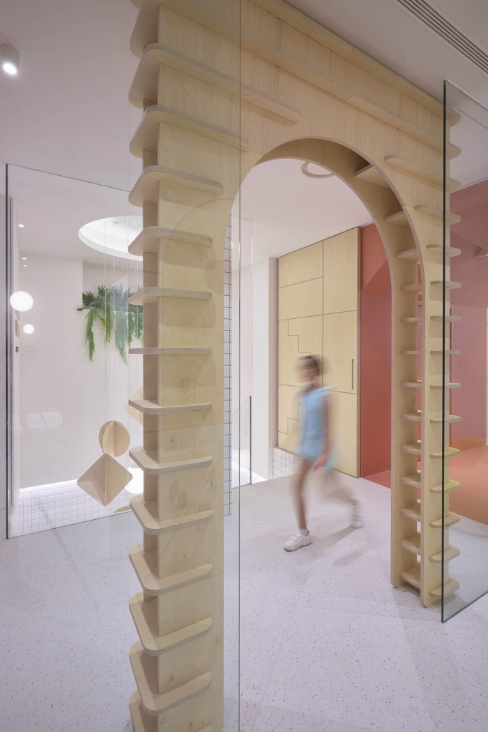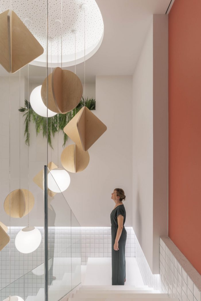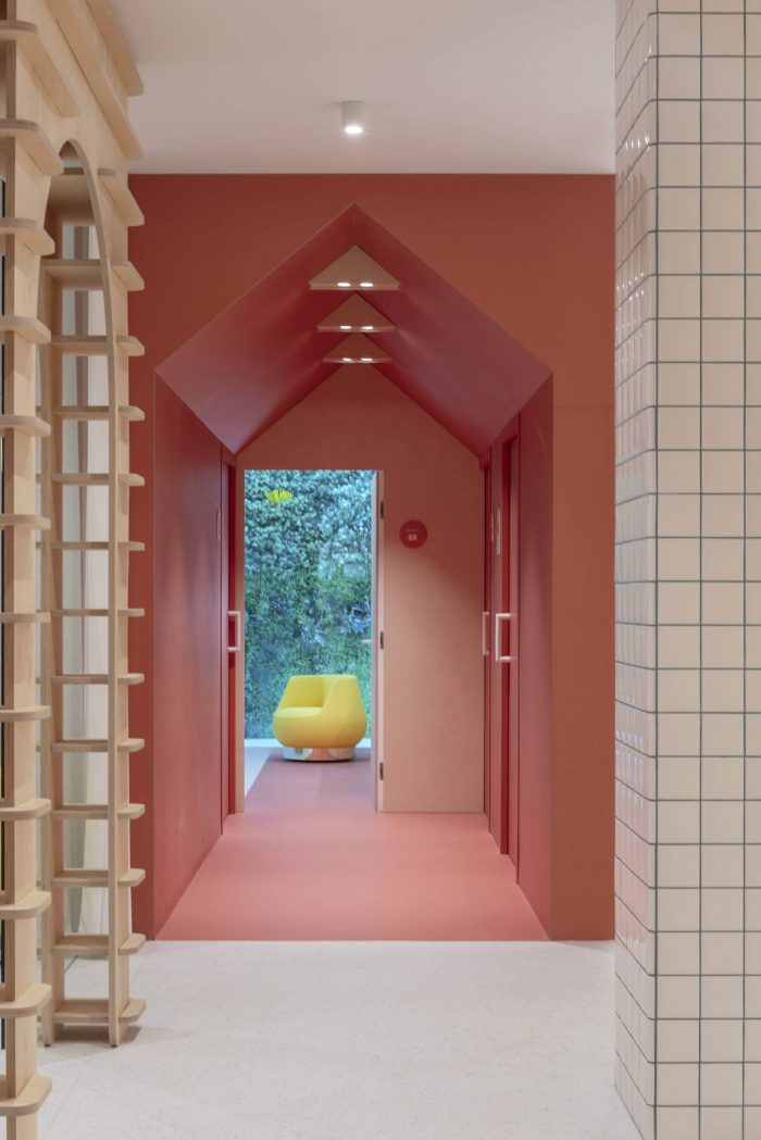 该创意轴的灵感来自于儿童认知发展的一些学习形式。品牌和企业的室内设计项目是以木片的建筑游戏和初级几何的拼图为起点产生的。诊所用可识别的超比例元素给儿童和成人带来了惊喜,这些元素指的是儿童的学习,如巨大的门廊、木制摩天轮形式的灯,或像拼图一样的镶板。其结果是一个令人回味的空间,与我们心中的孩子联系在一起,并让你感动。