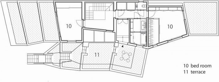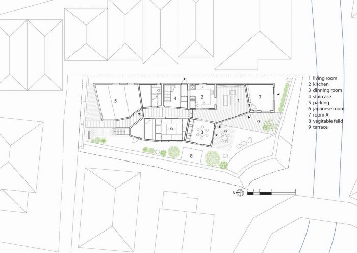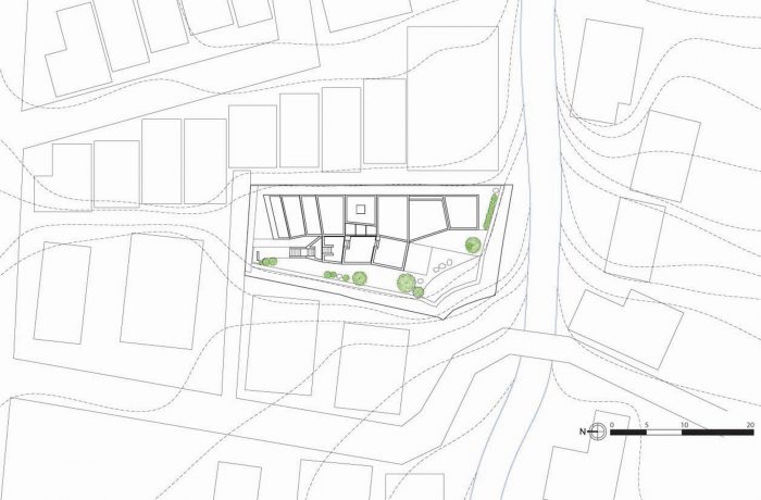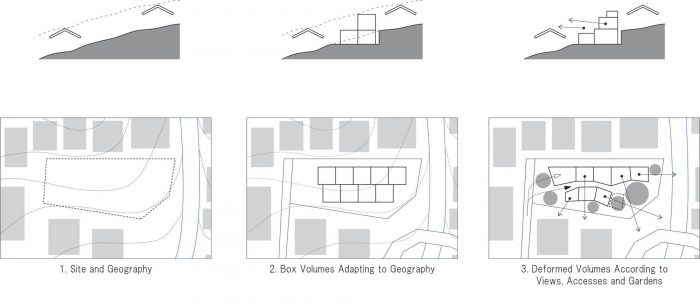 The site is developed along a stone wall that extended across the terrain.Multiple boxes, scaled to meet the utilities and the priorities were placed according to the contour line. Then these boxes were then deformed to respond to the views, the greenery, the activities, and the surroundings, which determined the form of the building. Spaces between the boxes became a cave-like sequence that opens up to the Osaka plain.This design generation process mediates the natural and the artificial, maximizes the use of the whole site, and creates diversity of utility and experience.