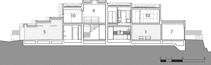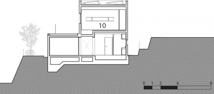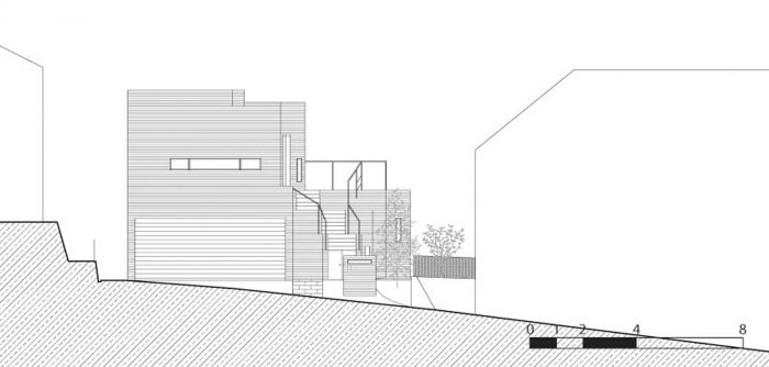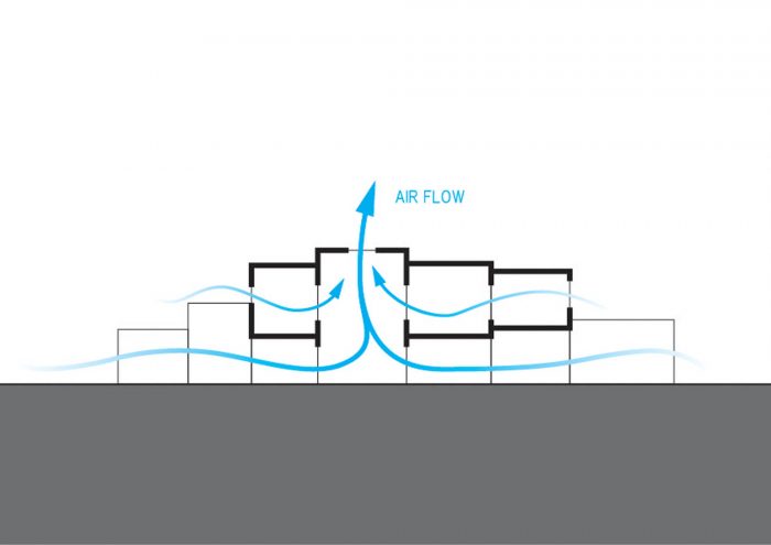 Thermal environment is also designed to connect to the surroundings. By providing at least 2 windows for each boxes, and by placing the gap between the boxes along the contour line, it allows the wind that blows constantly along the mountain terrain to pass through. Further, by arranging the tall staircase box in the middle of the building, it allows the chimney effect and wind circulation to occur, even in the state of windlessness. Moreover, in order to redistribute the rainwater to the soil and the plants on the site, a rainwater utilization system was adopted on the roof of the building.