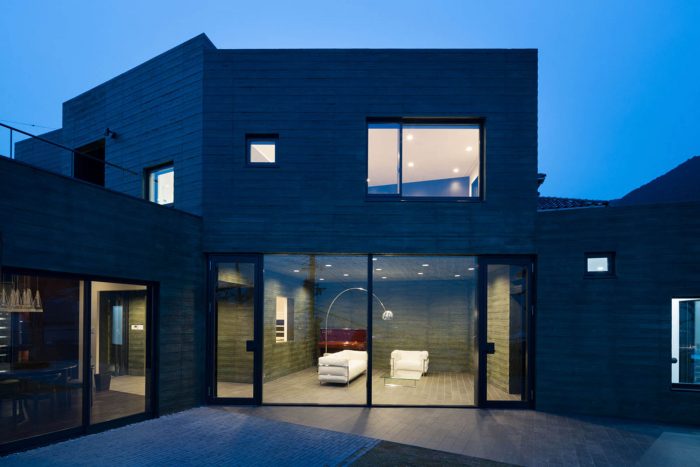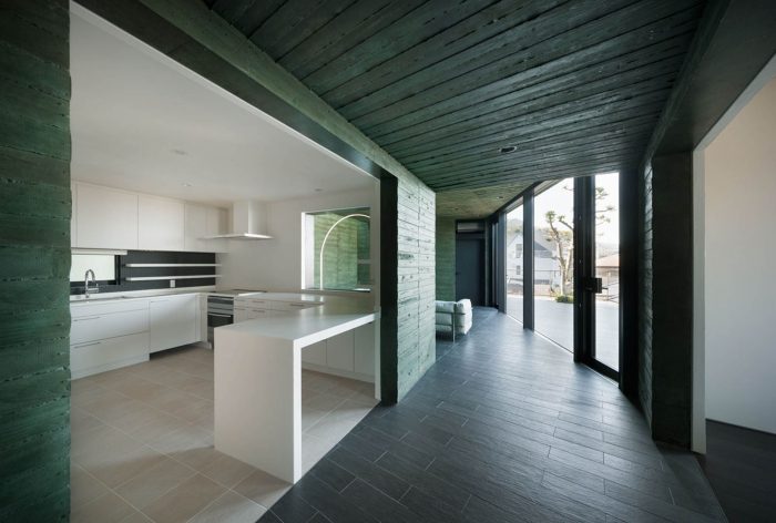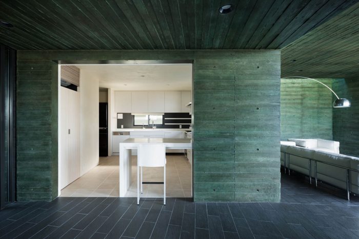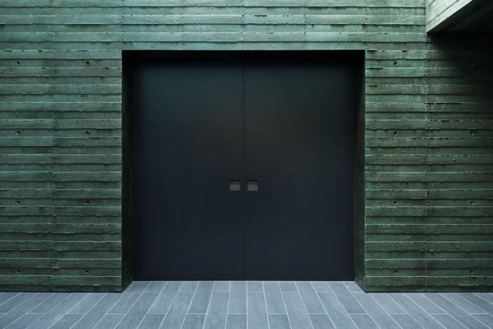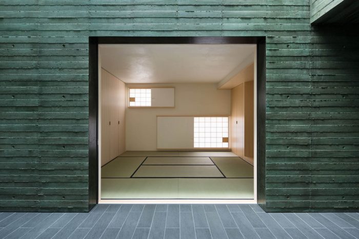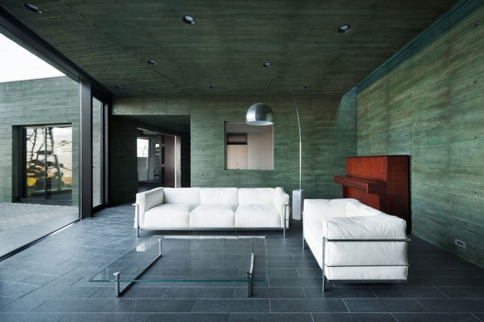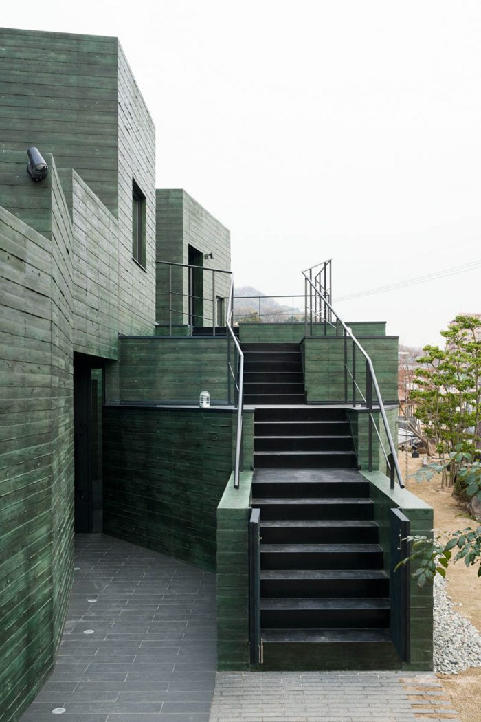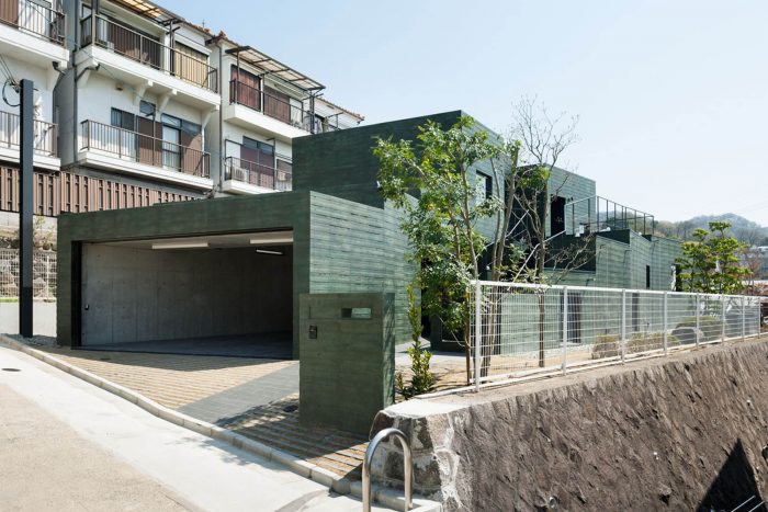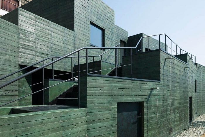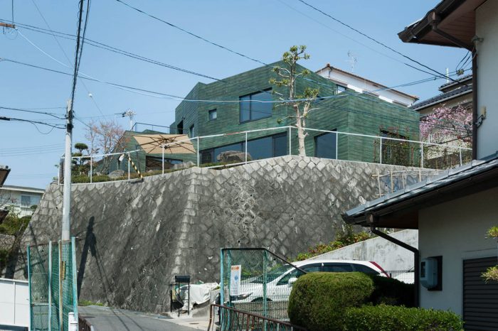The surface of the building was aimed to wear expressions that changes as with a creature. A condition between monochrome/color and artificial/natural was created, so that it magnifies the changes in hue and saturation each seasons. It looks like a rough engineering work, while it also looks like a rock covered with moss. It wears pitch black darkness, while it also wears countless shades of green.