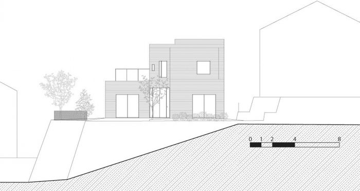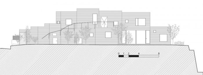 热环境的设计也是为了与周围的环境相连接。通过为每个盒子提供至少2个窗户,并将盒子之间的缝隙沿着等高线放置,使沿着山地不断吹来的风能够通过。此外,通过将高大的楼梯箱体安排在建筑的中间,即使在无风的状态下,也能产生烟囱效应和风的循环。此外,为了将雨水重新分配给场地内的土壤和植物,建筑的屋顶采用了雨水利用系统。