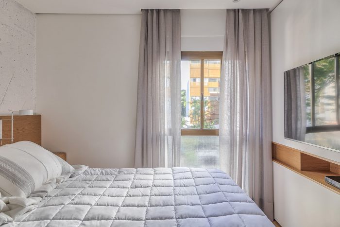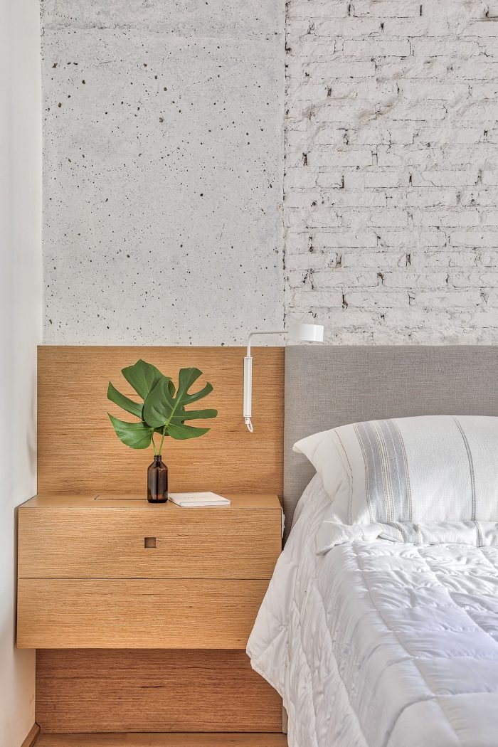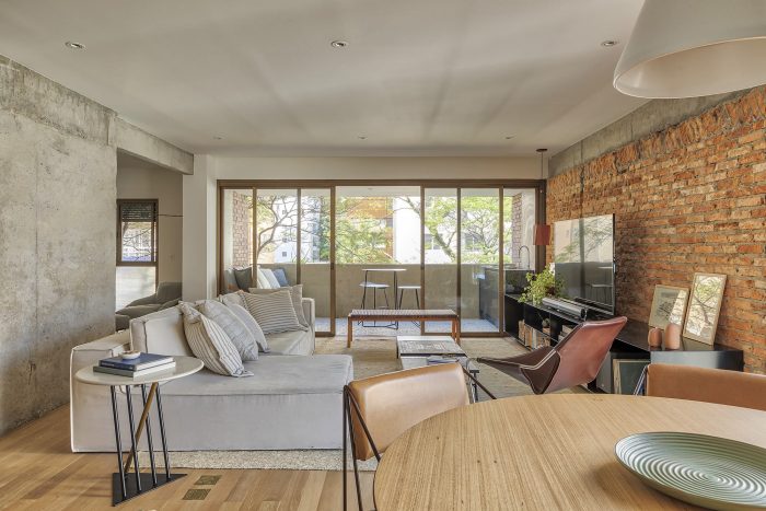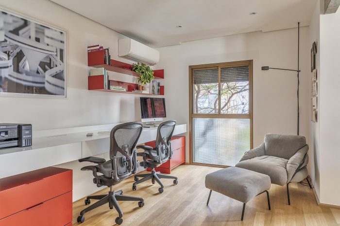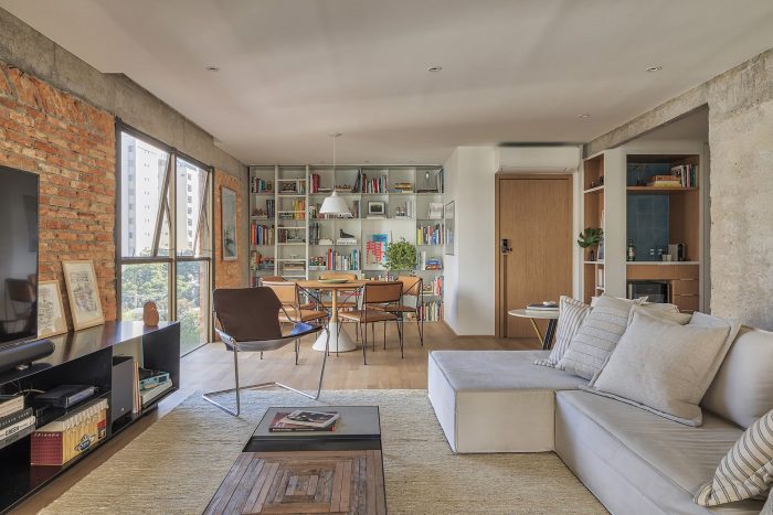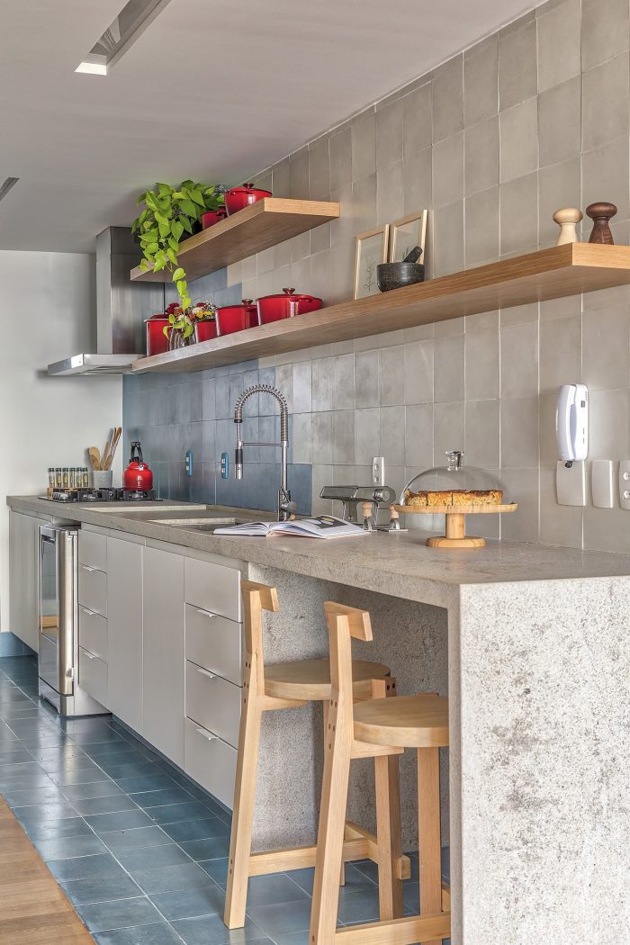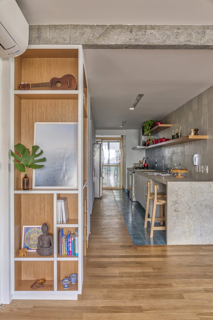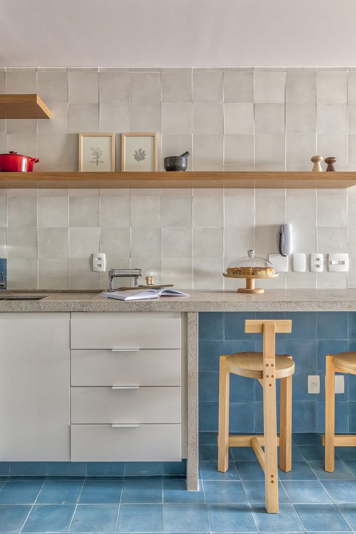 Based on these guidelines, the project, a collaboration between two offices from São Paulo (SOEK Arquitetura and VOA Arquitetura) was developed by relocating the toilet and integrating one of the bedrooms and the kitchen to the living room. The continuity of the environments was given by the wooden floor that also enters the kitchen, interrupted only by the workbench, where an island was made with the same hydraulic tile that covers the wall of the workbench.