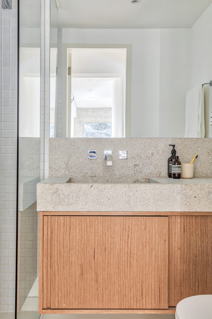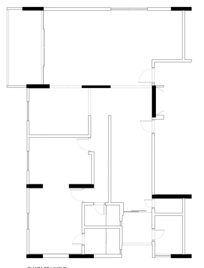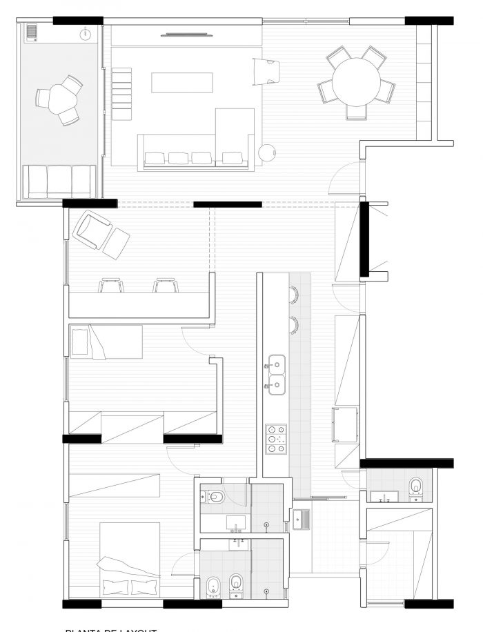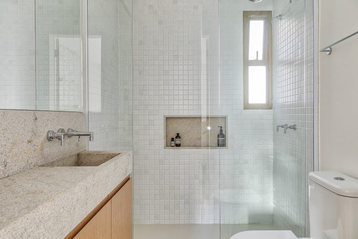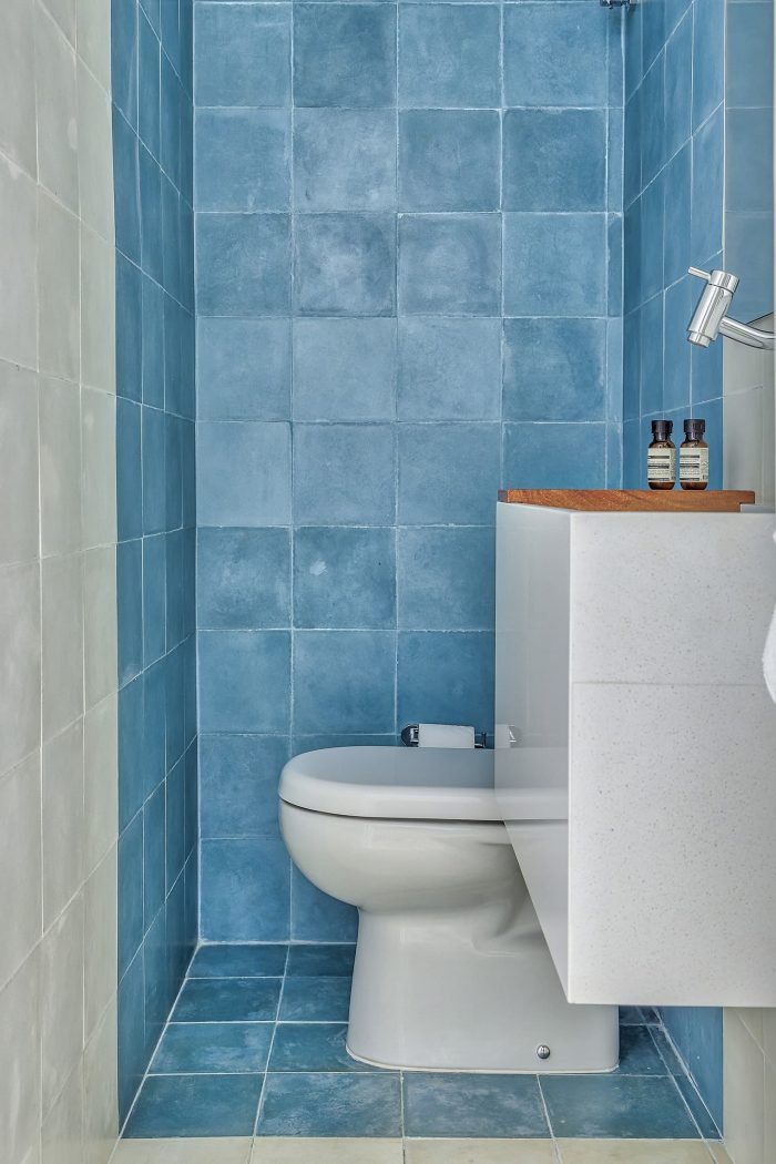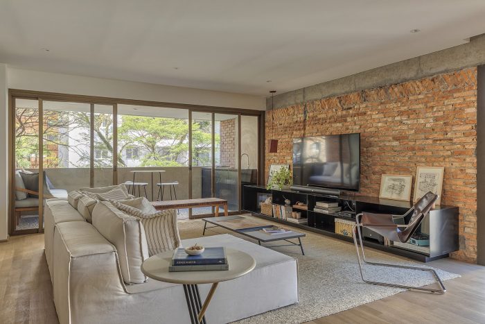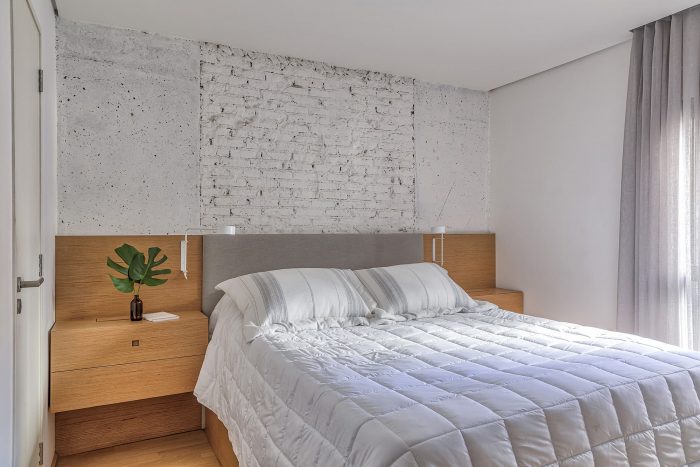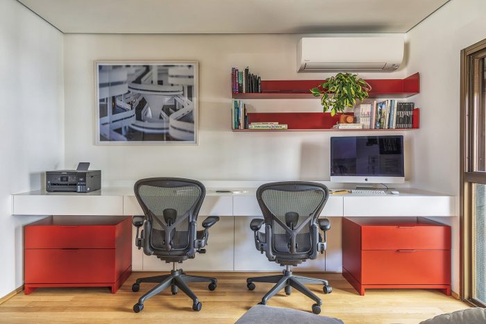 Based on these guidelines, the project, a collaboration between two offices from São Paulo (SOEK Arquitetura and VOA Arquitetura) was developed by relocating the toilet and integrating one of the bedrooms and the kitchen to the living room. The continuity of the environments was given by the wooden floor that also enters the kitchen, interrupted only by the workbench, where an island was made with the same hydraulic tile that covers the wall of the workbench.
