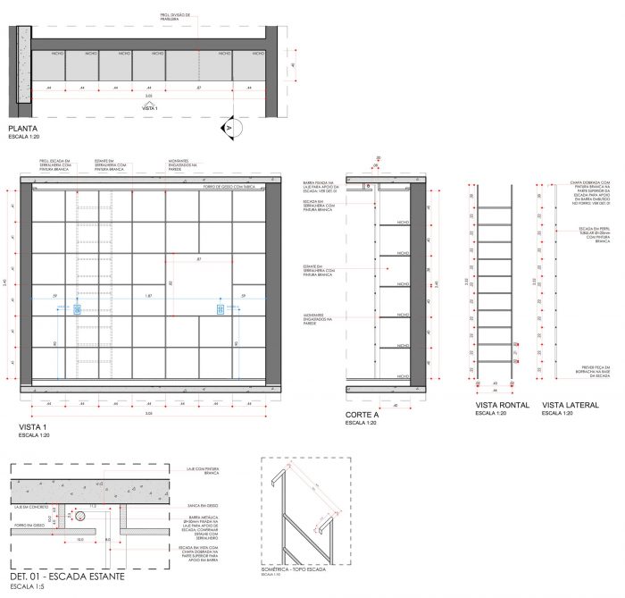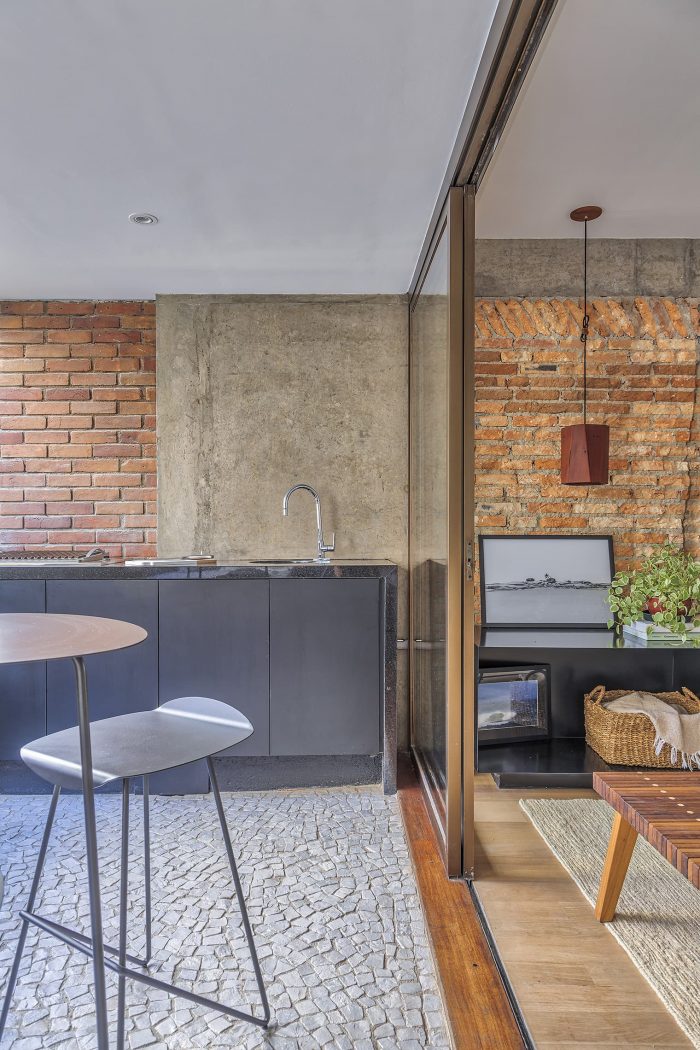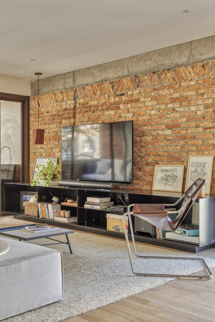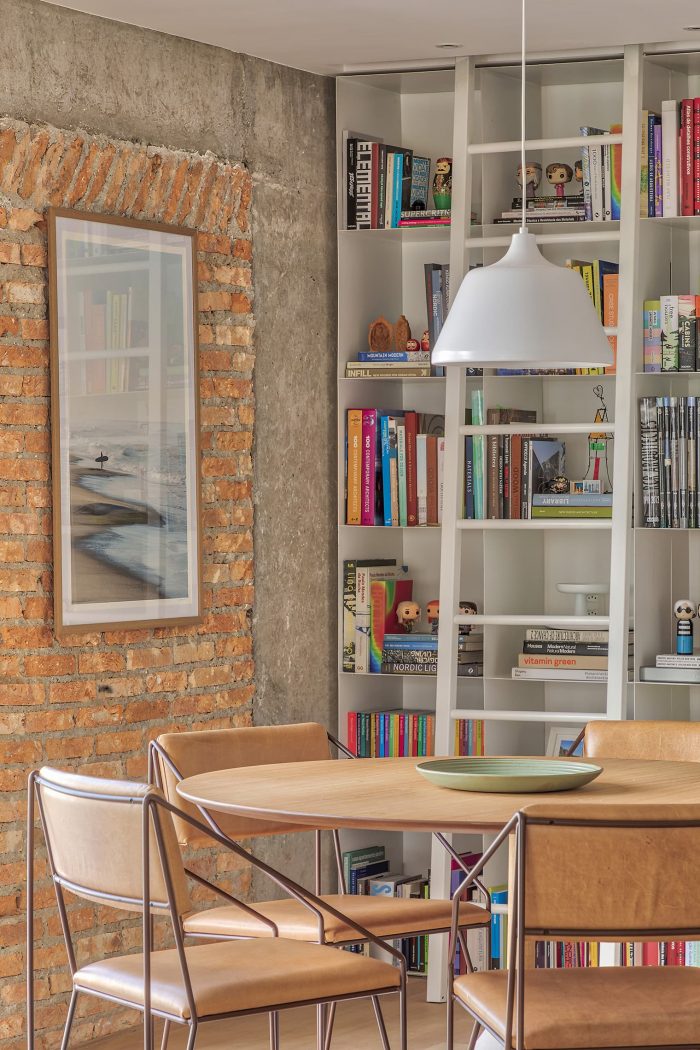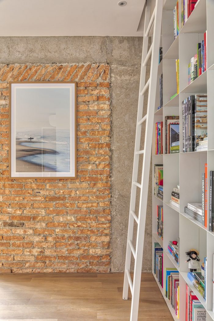 In the living room and bedrooms, the walls were stripped down to show the brick and concrete elements from the original construction of the building, which cover the building's façade. Next to these, bookshelves, shelves, and a sideboard made of metalwork were placed, which, due to their lightness, are in the background in relation to the aforementioned materials.