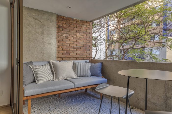 The balcony of the apartment was, at the client's request, a place of attention. The canopy of trees on the apartment's level gives the balcony a pleasant atmosphere, which has become one of, if not the couple's main living areas. On it was built a black granite countertop with a plate and a sink. The floor, in Portuguese mosaic (typical coating of the city sidewalks) was made to characterize the feeling of outdoor space.
