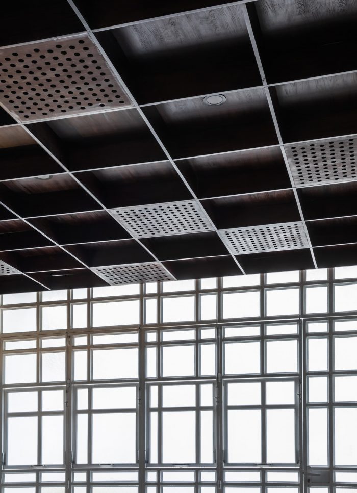 第四:对于靠近马路的房屋空间,经常受到交通噪音的影响,内墙采用了表面粗糙的饰面材料,天花板系统也设计成空心框架系统,有厚度,既有美观效果,又能吸音。