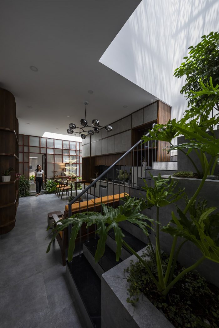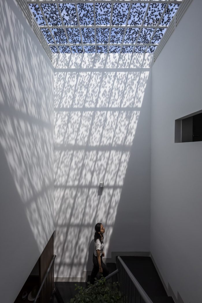 Second: When letting natural light into the house, it is necessary to calculate, experiment, and check the reality to regulate the amount of light to be suitable for daily activities as well as provide enough for green plants to grow and develop. In the J house, solar glass is used to reduce 40-45 % of heat in the skylight area. The solution of spreading stones above the glass also regulates light and creates shade. As a result, the indoor space is always filled with natural light but not hot, moreover, the shade from the stone layers creates an effect like the sun through the leaves, helping to increase the feeling of nature in the townhouse space.