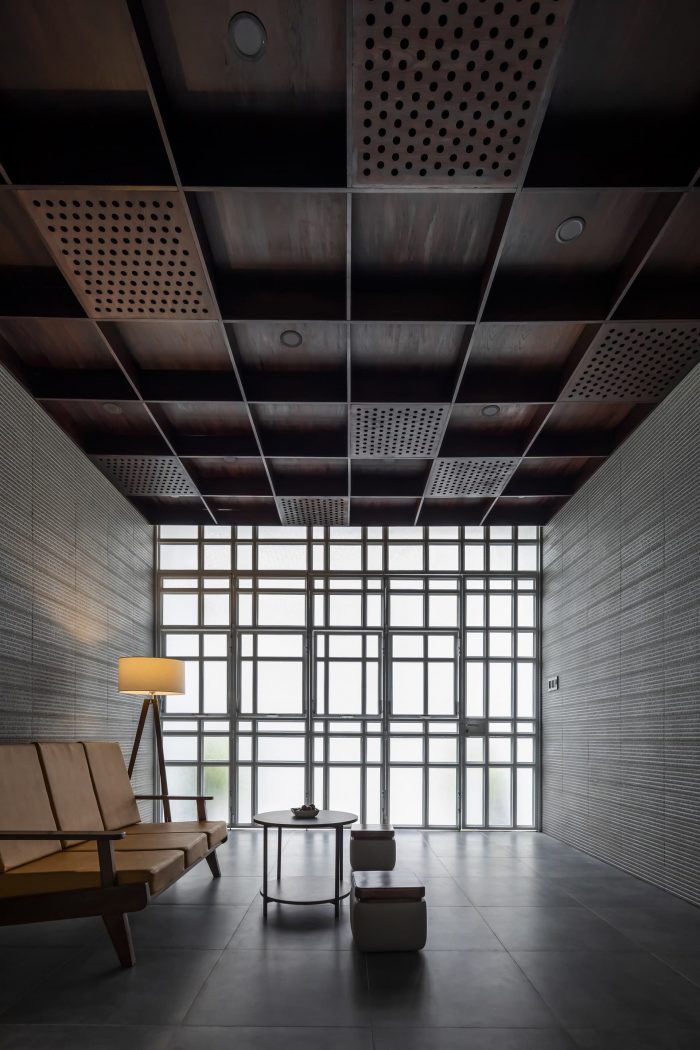 Fourth: For the space of the house near the road that is often affected by traffic noise, the interior walls used finishing materials that have rough surfaces, and the ceiling system is also designed as a hollow frame system, with thickness, both aesthetic effect, and noise absorption.