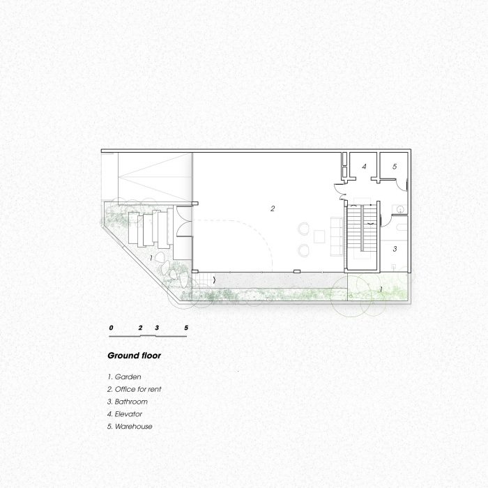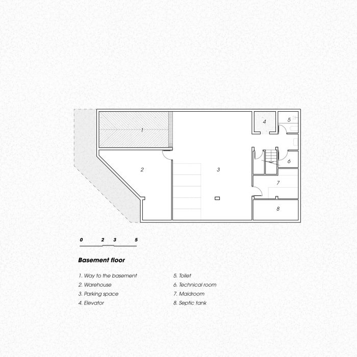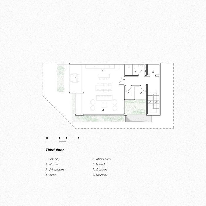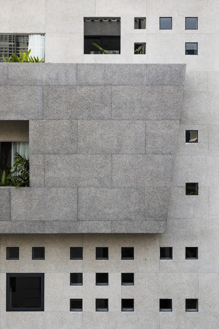 空间被分隔成不同的层次,内部和外部采用同质的水洗石(花岗岩)材料,模糊了边界,只有主体和主体周围的气氛形成了实体。按使用目的和发生的每项活动对空间进行计算。
