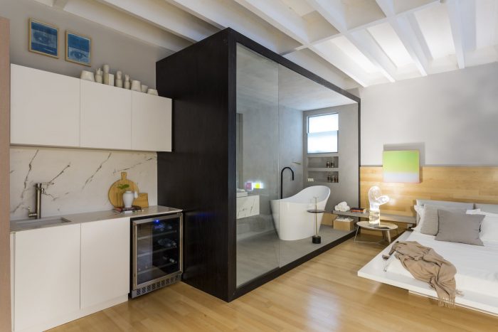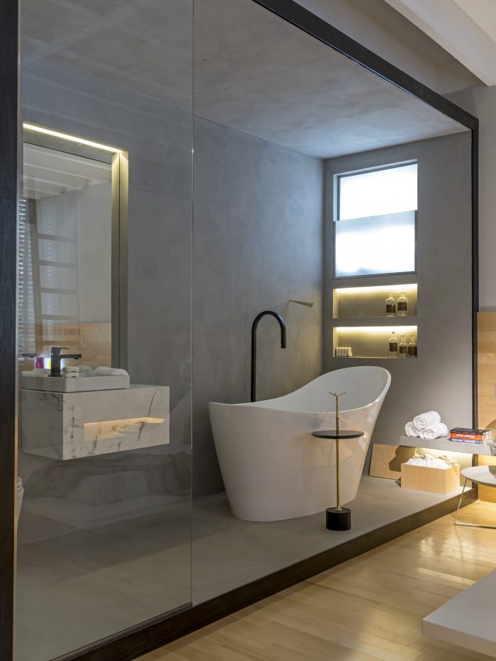 Following into the environment, you pass by the conceptual bar, also supported by the bench, with Maple wood boxes designed by the architect himself - the same as the floor -, which house cups, various bottles of drinks and laboratory glassware garnered by Nildo in the Bixiga neighborhood. The same boxes, as well as the concrete seat, permeate other environments of the project. "The boxes are versatile and, therefore, gain various uses, such as bar boxes, support for decorative objects, such as the Acierno ceramics and, in the bathroom, used to support the bathrobe," explains the professional.