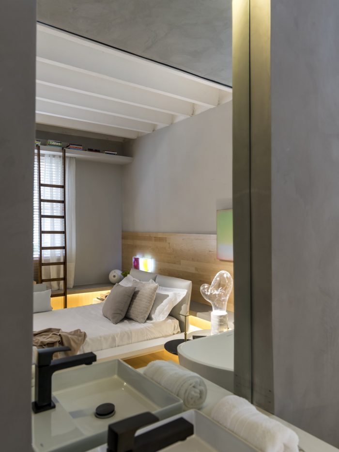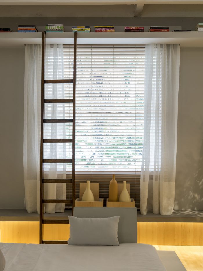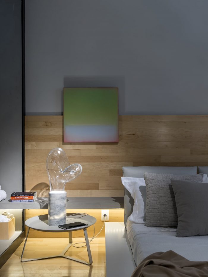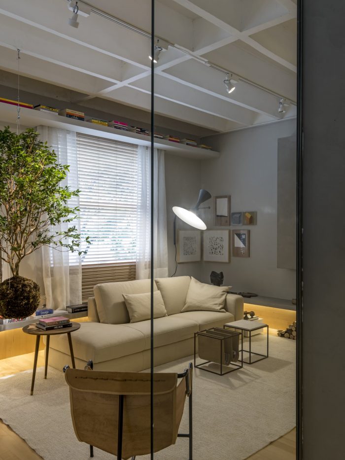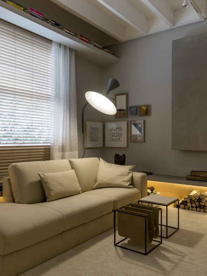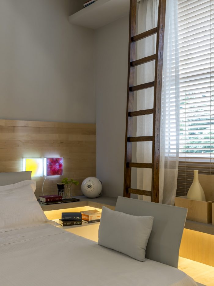 Following the sequence of the bench, right in front, the furniture serves as two seats for the dining table (Breton). In this space, it gains two cushions for back support. The dining room also has a Jorge Zalzuspin chair (supplied by Etel) and a stool (Dpot), signed by Claudia Moreira Salles. The stool also serves as a fireplace wood support and functions on the other side as a side table for the Natuzzi sofa as a book support. After going through all this, the furniture finally assumes its exclusive function of being a bench, until it reaches the bedroom, where it takes its turn as a bedside table, also signed by the young architect, exclusive to Codex Home.
