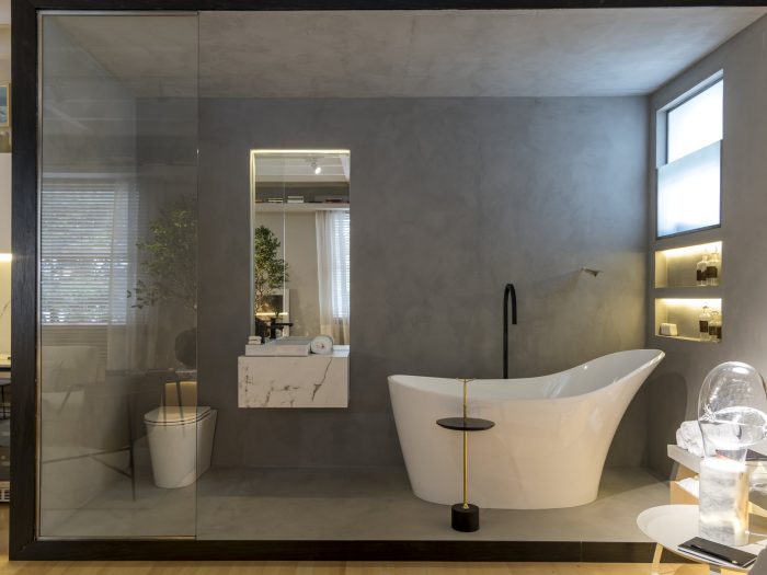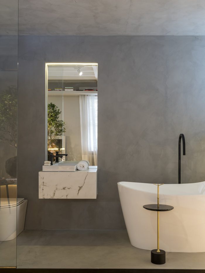 The bathroom draws attention for being a black box lined with eban wood, with a concrete interior in the Mr. Cryll (Bricolagem Brasil) finish. The countertop is produced in Dekton Consentino Kairos - Silestone's finish, executed by Mont Blanc Marble, which perfectly reproduces the Carrara marble, the Doka bathtub and Deca sanitary ware.