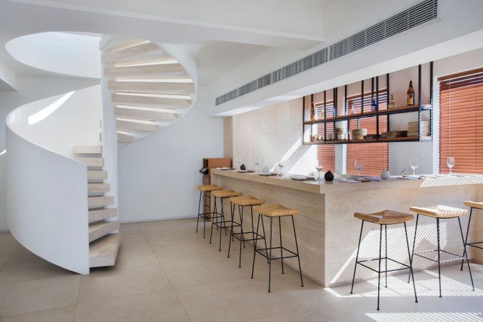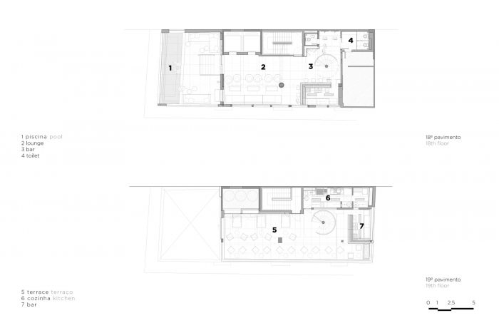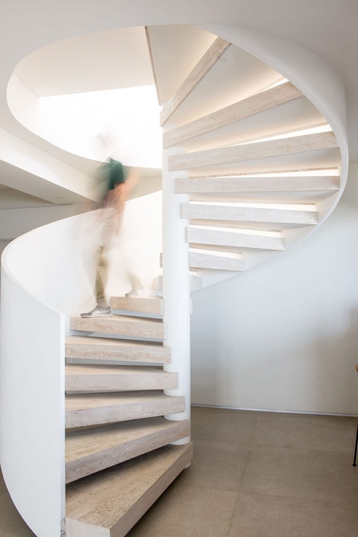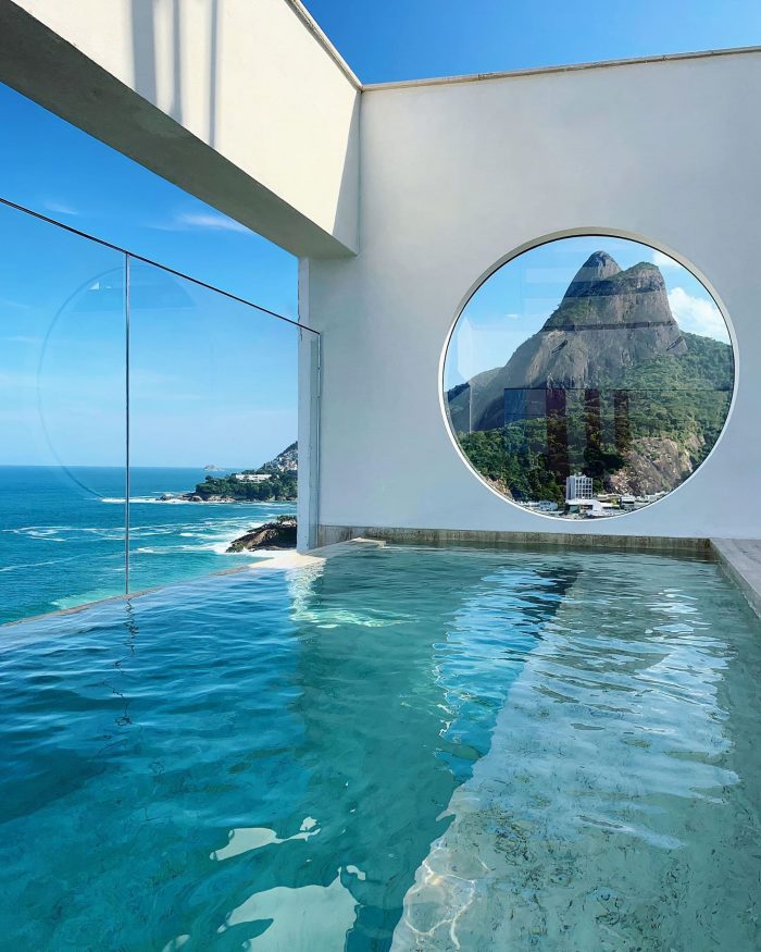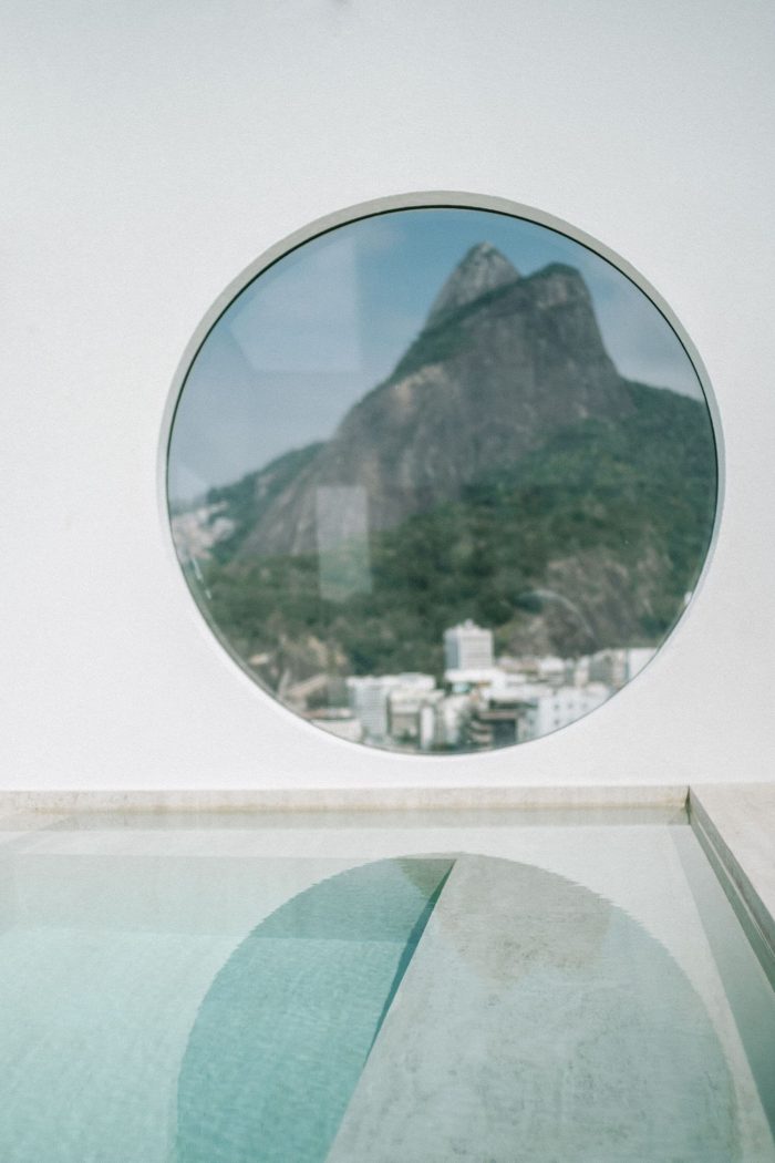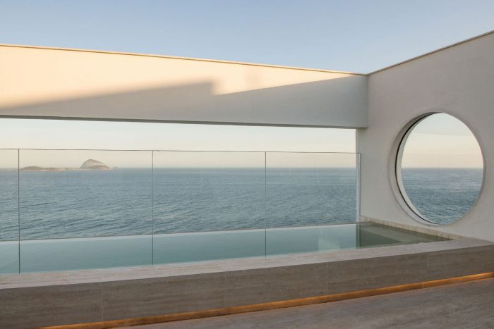 For access to the upper floor lookouts, a loose spiral staircase shaping as a ribbon tape was designed, strengthening the organic element within the project. Floating walls seek the simplicity of geometry and linen curtain planes as filters of natural light. The round openings characterizes our architecture, as an element which has been more recently introduced in our projects. Here, positioned closely to the infinity pool, it allows for a perceptual appreciation of an iconic vision of Rio de Janeiro, the imposing mountain complex called Dois Irmãos.