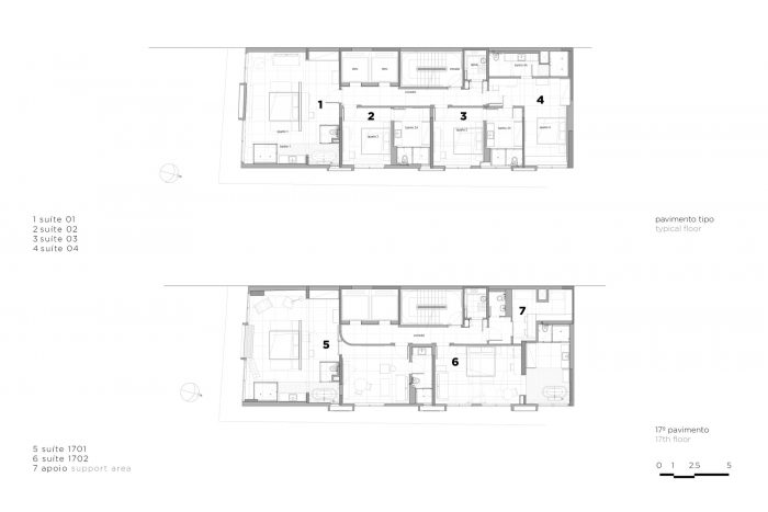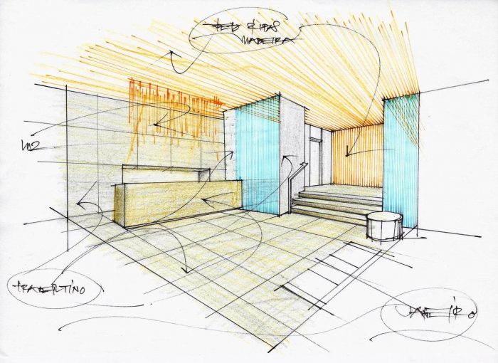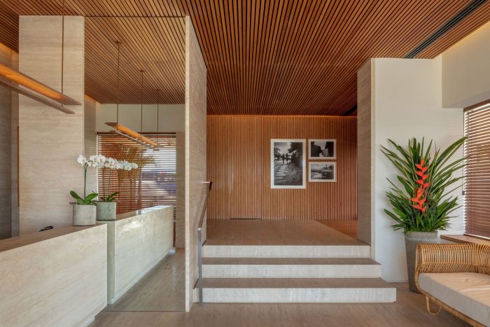 We sought to enhance the openings to the outside, the orientation towards the widest view and the extension of beach elements. The general use of compositions made by natural and organic materials aimed to inspire a welcoming environment. The strong presence of natural Freijó wood, alongside the sandy texture of travertine marble, aide in drawing up the construction and strengthening the design of the ensemble, marked by horizontal and vertical planes. These components were used in repetition, attempting to provoke an inner visual force. Linear elements are featured throughout, seen in large slatted panels, brise-soleils and in uneven and interspersed outlines.