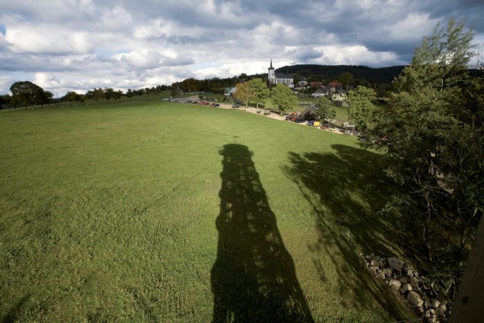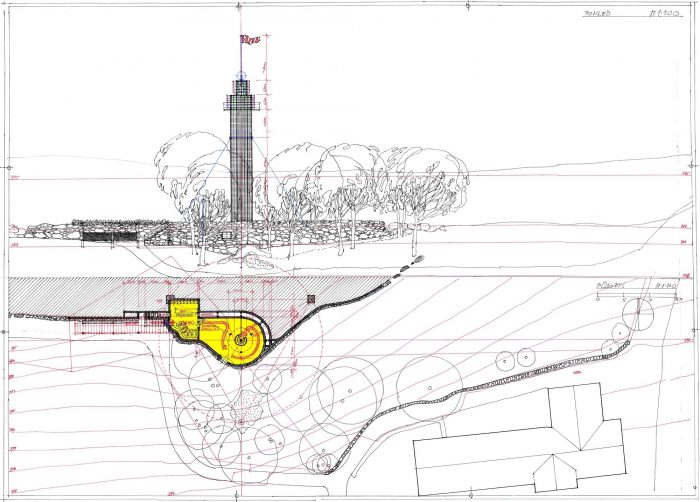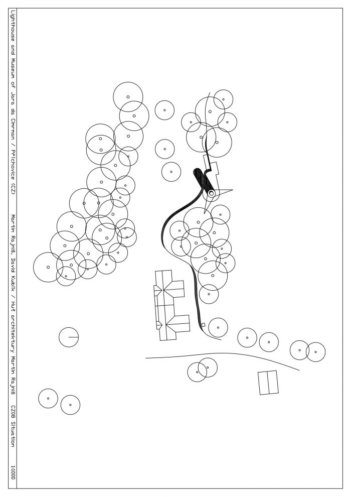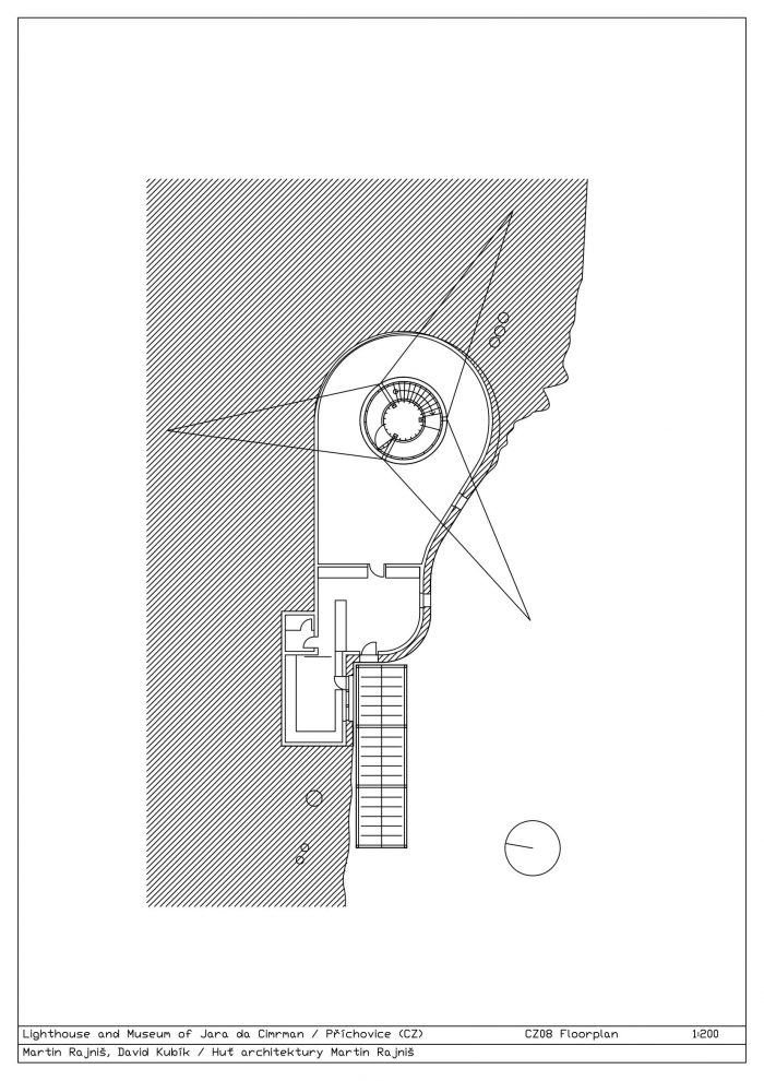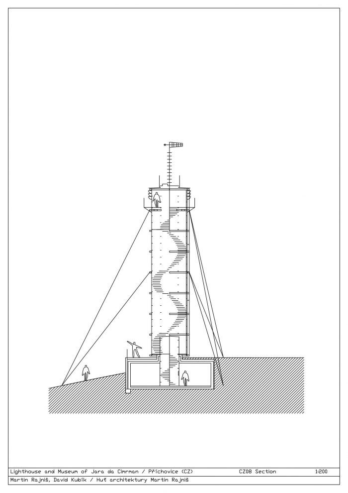 Jára da Cimrman’s Lighthouse and Museum were built on an impetus from Aleš Voverka. They complement the U Čápa establishment on the southern slope below Příchovice in the Jizera Mountains. The viewing tower and the museum should increase the rates of visitors to the guesthouse in summer. The investors have been trying to build a nice and well- functioning place with their own resources (no subsidies). The exceptional landscape framework is close to their hearts; they build pastures and footpaths, take care of tree lines, and have built a viewing tower. The Museum of Cimrman’s Times is virtually invisible. It is completely embedded in the slope and covered with a stone wall, which smoothly connects to the other walls criss- crossing the site along the contour lines. You could say this is a horizontal element typical of the area.