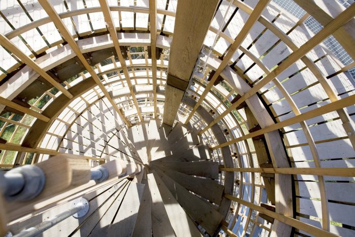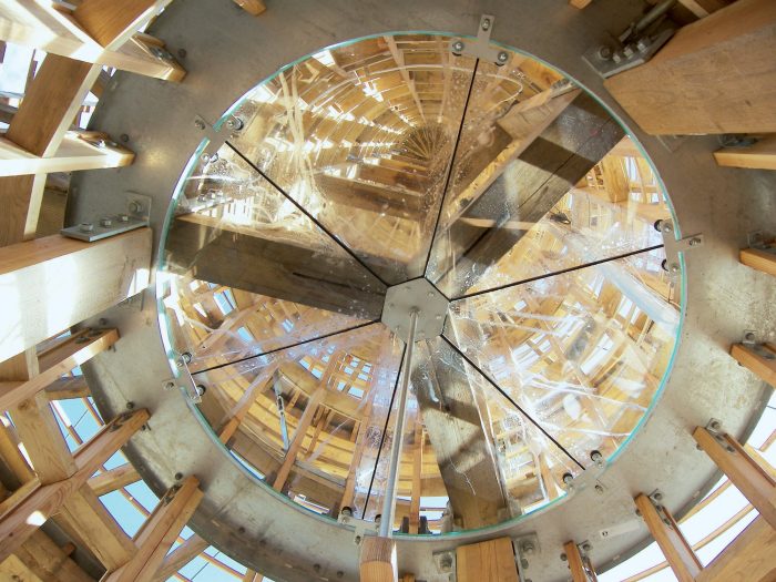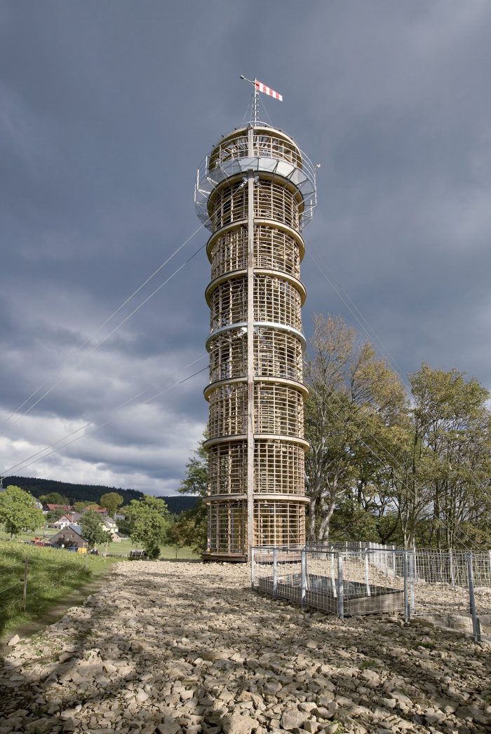The aesthetic concept of the structure is based on the contrast between the horizontal walls and the verticality embodied by the wooden Beacon structure. The stone was mined directly on the excavation site, the wood originates from the Jizera Mountains (Douglas fir for framework, oak for stairs).