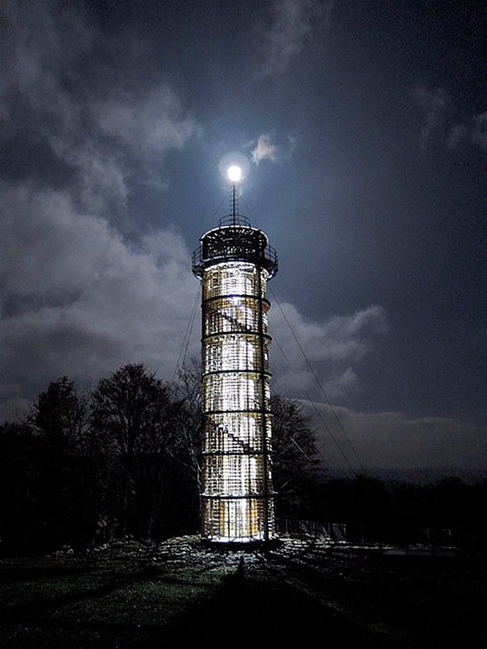 Visitors enter the museum (made in co- operation with the real Cimrman gang) via a hole in the stone wall and continue up the spiral staircase, rising from the very centre of the museum, to the viewing platform of the beacon 18 m high up. The top of the beacon is fitted with the typical attributes such as a gallery, a mast, a flagstaff, and segmented glazing. It contains a panorama board with descriptions of the views.
