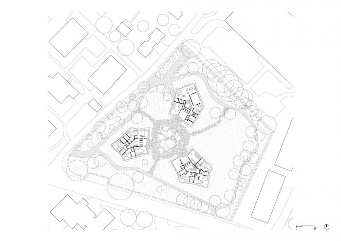 It incorporates it into a heterogeneous existing architectural context consisting of ten-story housing developments to the southeast and semi-detached homes to the west. As the plan's centerpiece, the park project is the result of a competition won by the firm Vulcan, which proposed maximal use of the plot through a peripheral loop promenade for its residents.